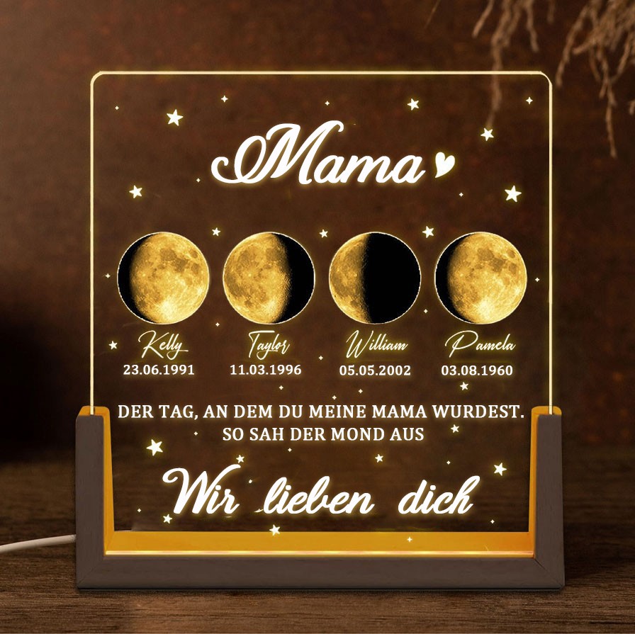 Der Tag, an dem du meine Mama wurdest. Personalisiertes Nachtlicht mit Mondphase für Mama nach Datum mit den Namen der Kinder. Geschenke für Mama zum Muttertag.