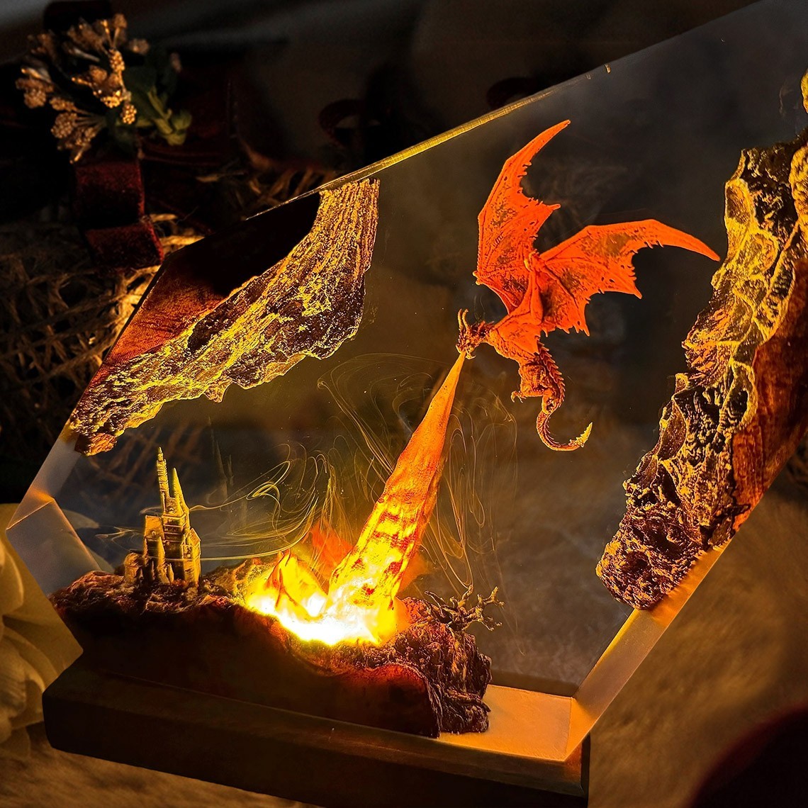 Feuerdrachen-Lampe aus Harz und Holz: Geschenkidee zu Halloween & Geburtstag für Ihn