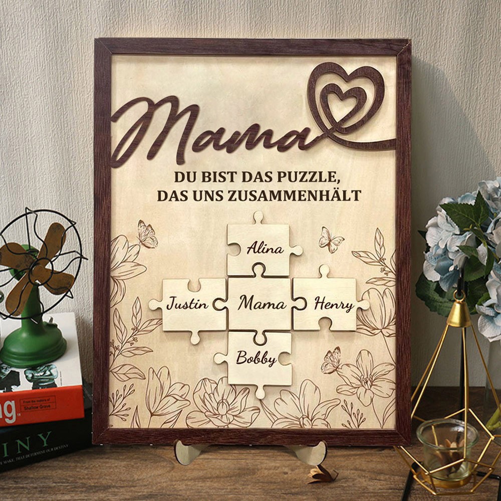 „Mama, du bist das Teil, das uns zusammenhält“. Individuelles Puzzleteil-Rahmenschild mit Kindernamen, Geschenk für neue Mutter, einzigartige Geschenkideen zum Muttertag