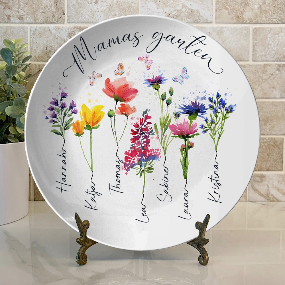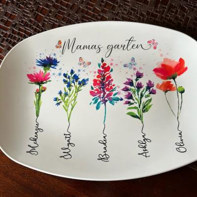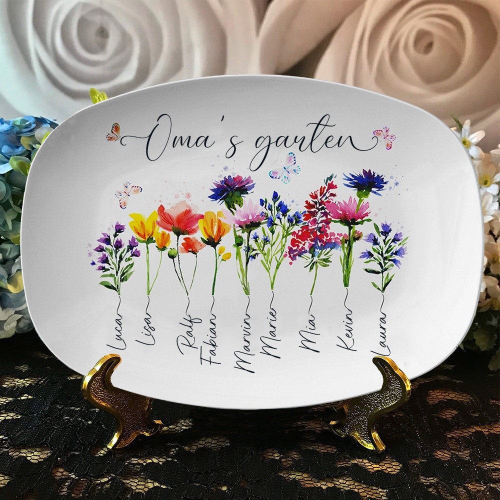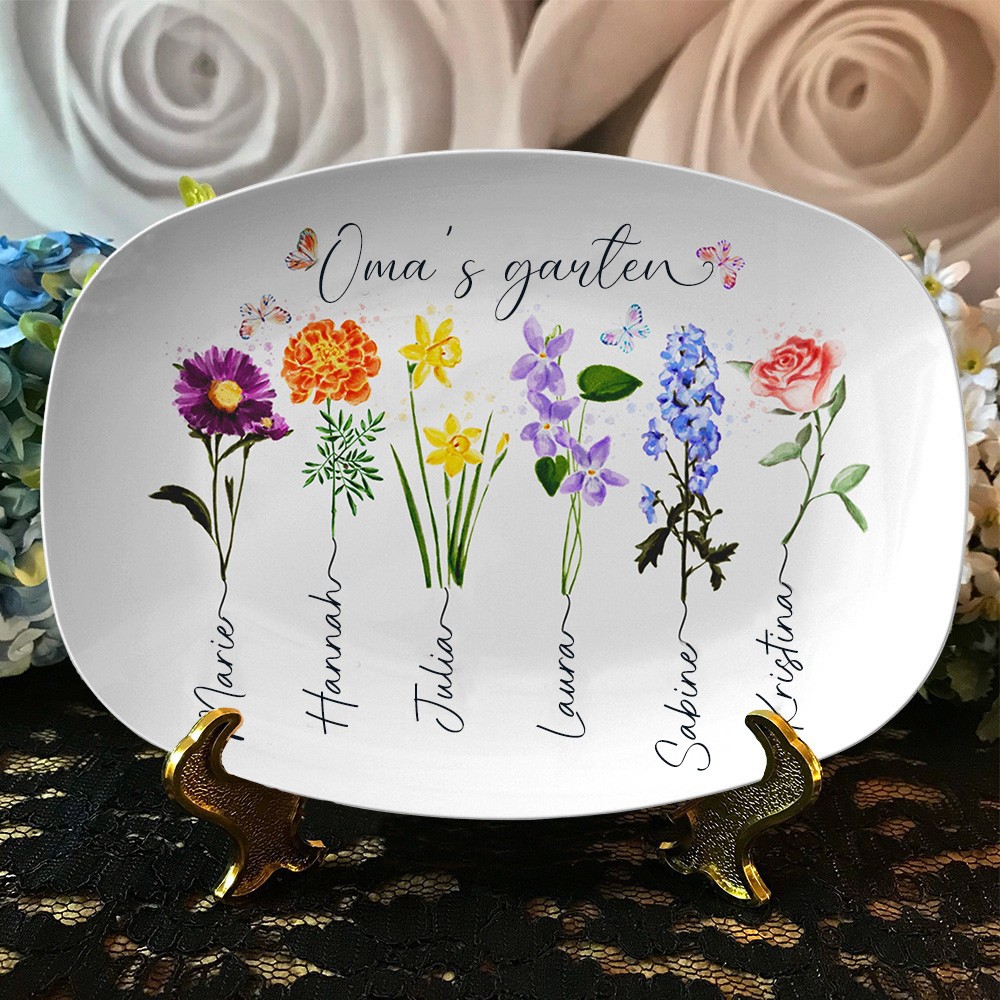 Personalisierter bedruckter Gartenteller für Oma mit Geburtsblume und den Namen der Enkelkinder, einzigartiges Geburtstagsgeschenk für Mama, Oma, Muttertagsgeschenkideen, Familienkunstgeschenk