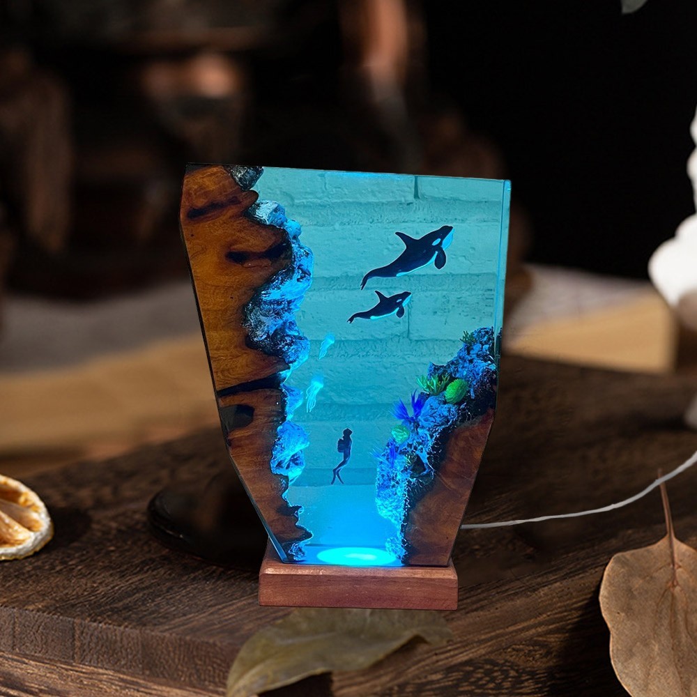 Orcas und Baby-Orcas-Lampe aus Kunstharz, Holz, Nachtlicht, individuelle Geschenke für Zuhause, einzigartige Geburtstagsgeschenkideen, ein besonderes Geschenk für Sie oder Ihn