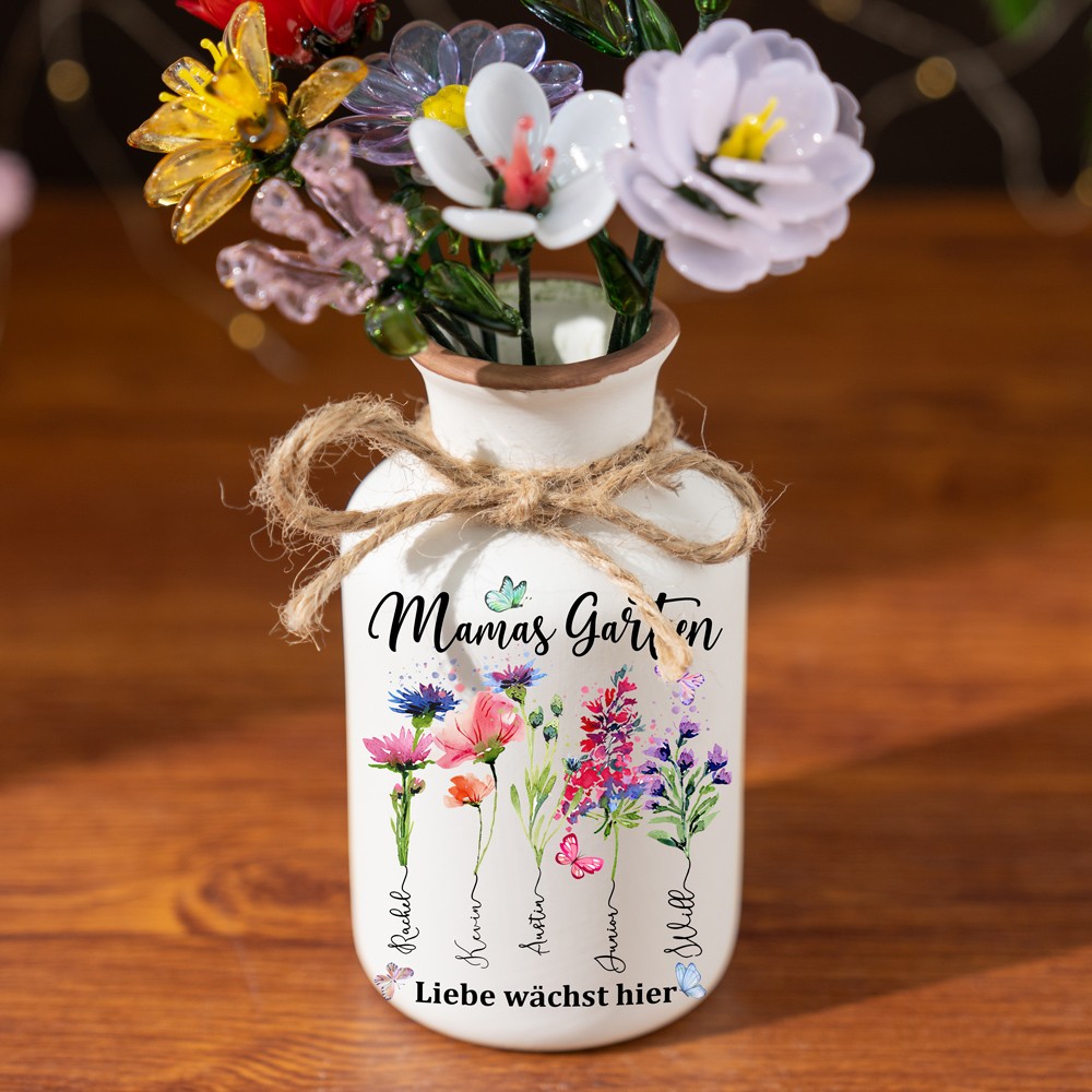 Personalisierte Blumenvase für den Garten der Großmutter mit Geburtsmonat und den Namen der Kinder. Geburtstagsgeschenke für die Mutter. Einzigartiges Gartengeschenk für die Großmutter. Muttertagsgeschenk.