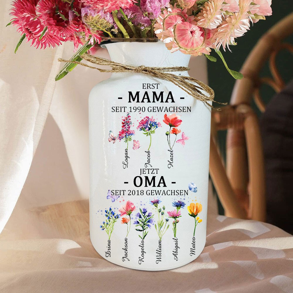 Personalisierte Blumenvase mit der Aufschrift „Erste Mama, jetzt Oma“, Geburtsblume, Familienvase mit den Namen der Enkelkinder, einzigartiges Geschenk für den Innenbereich für Mama, Oma, Geschenkideen zum Muttertag