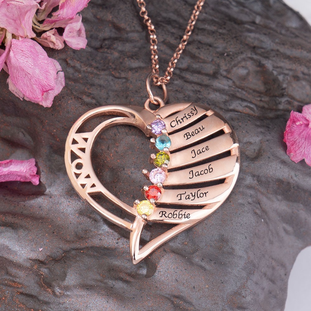 Personalisierte herzförmige Halskette mit Geburtssteinen für Mütter und den Namen ihrer Kinder – Geschenkideen zum Muttertag