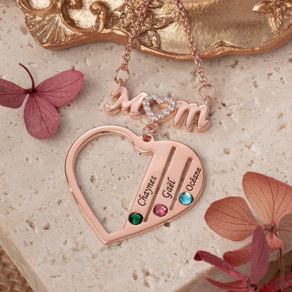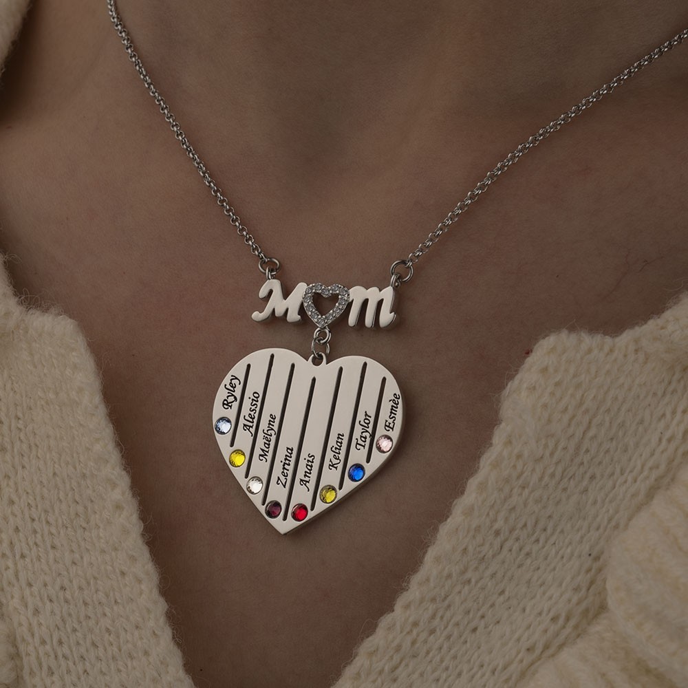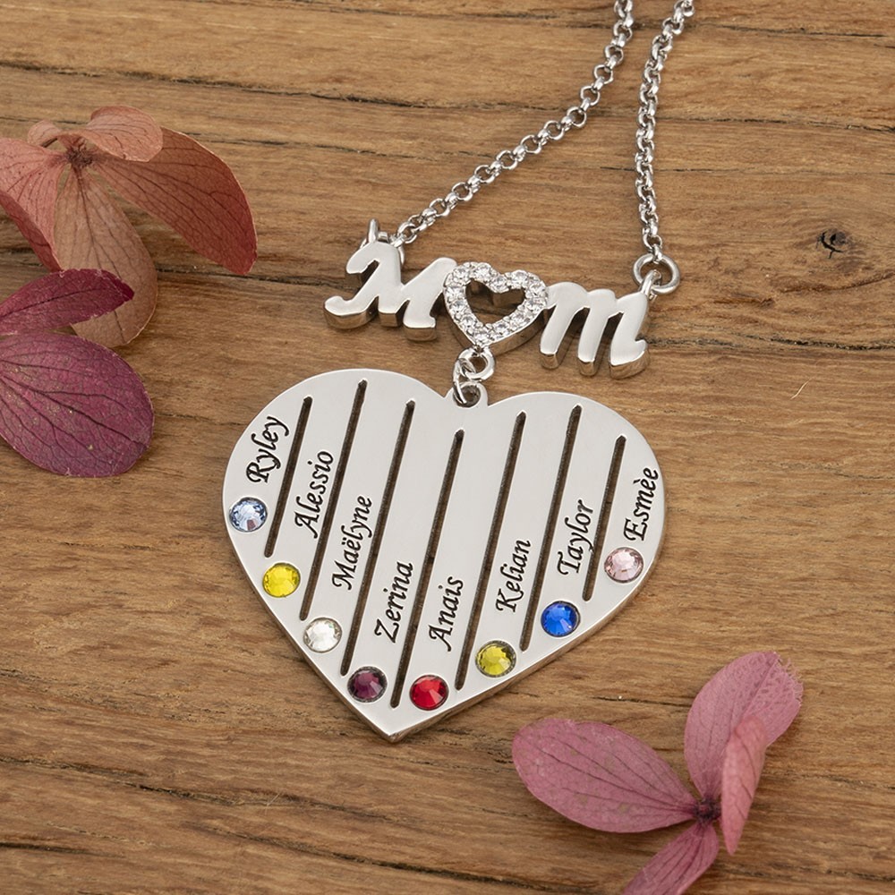 Personalisierte herzförmige Mama-Halskette mit eingravierten Namen und Geburtssteinen. Ideen für Familiengeschenke