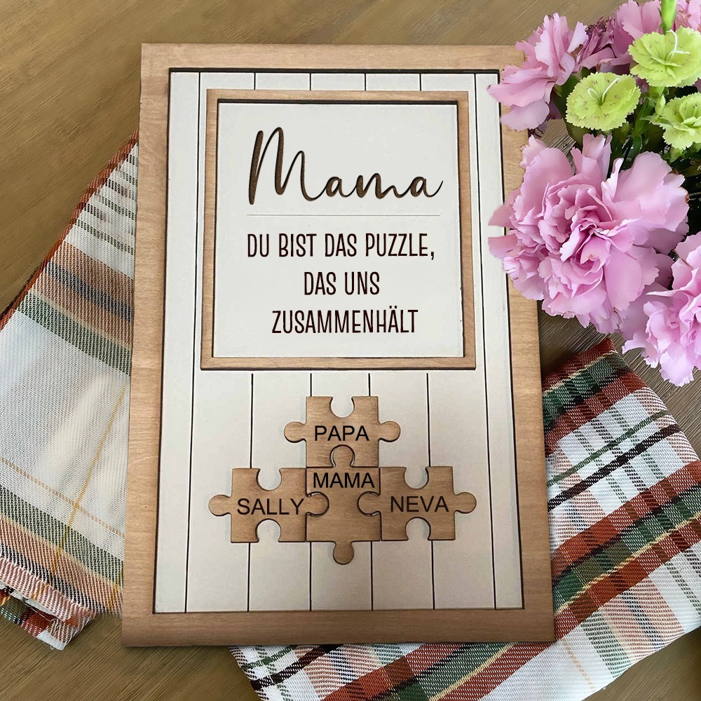 Personalisiertes Mama-Puzzle aus Holz mit Namensschild „Mama, du bist das Stück, das uns zusammenhält“, Familienandenken, Geschenk für Mama, Oma, mit Kindernamen – einzigartige Geschenkideen zum Muttertag