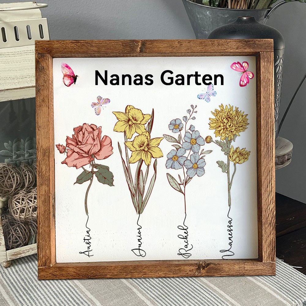 Personalisierte Holzplakette „Mamas Garten“ mit Geburtsmonatsblumen und den Namen der Kinder – Unisex-Geschenk für Mama und Oma zum Muttertag und zu Weihnachten