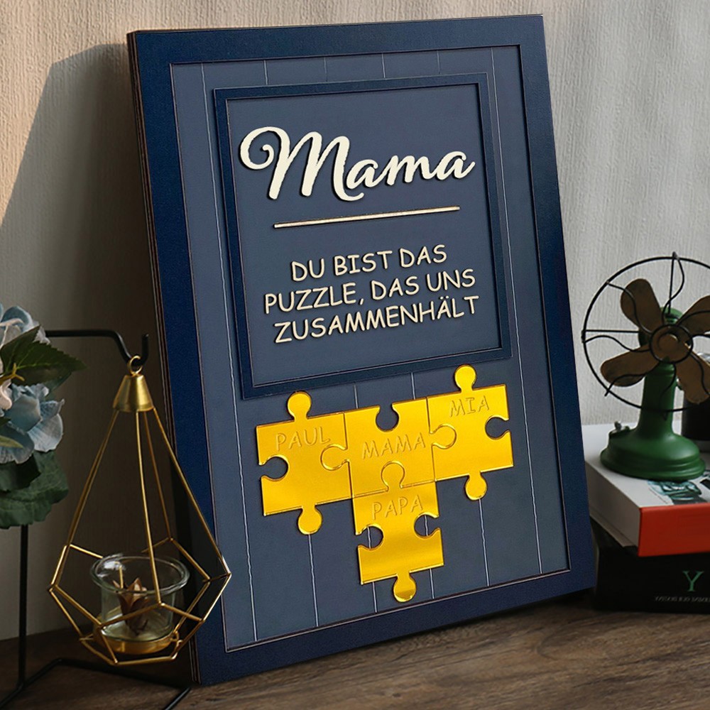 Personalisiertes Schild „Mama, Du bist das Teil, das uns zusammenhält“ aus Holz mit Puzzleteilen und Namen, einzigartiges, ideales Geschenk für Mama, Oma, Geschenkideen zum Muttertag