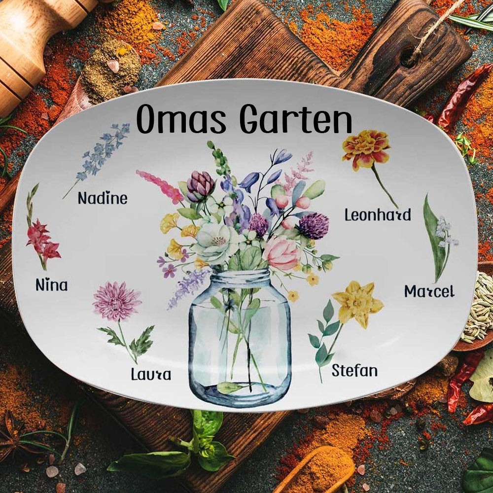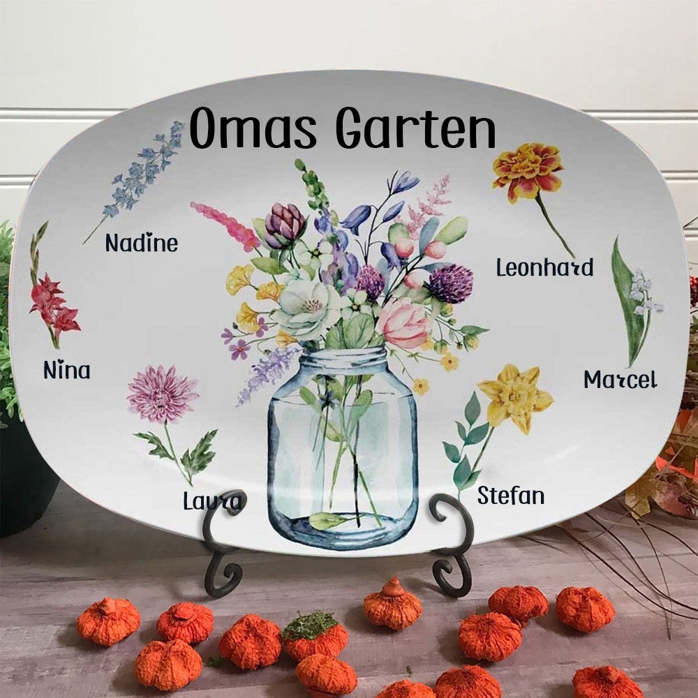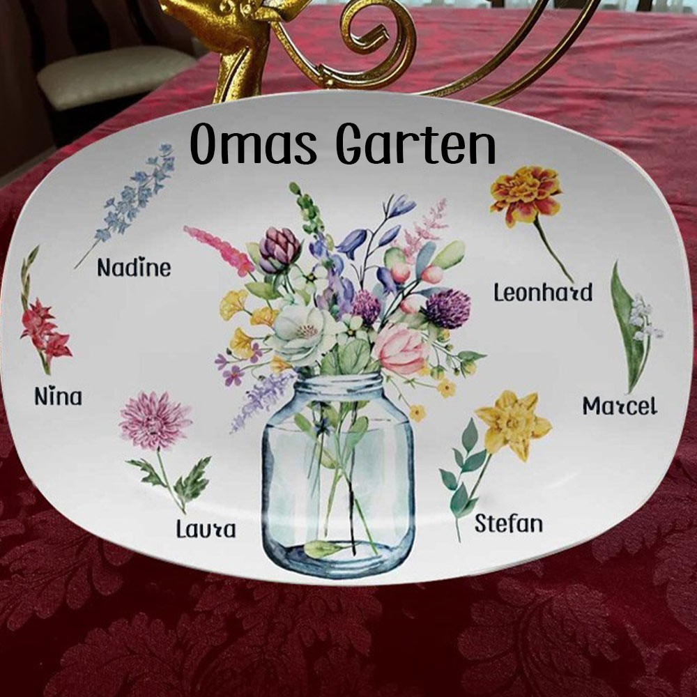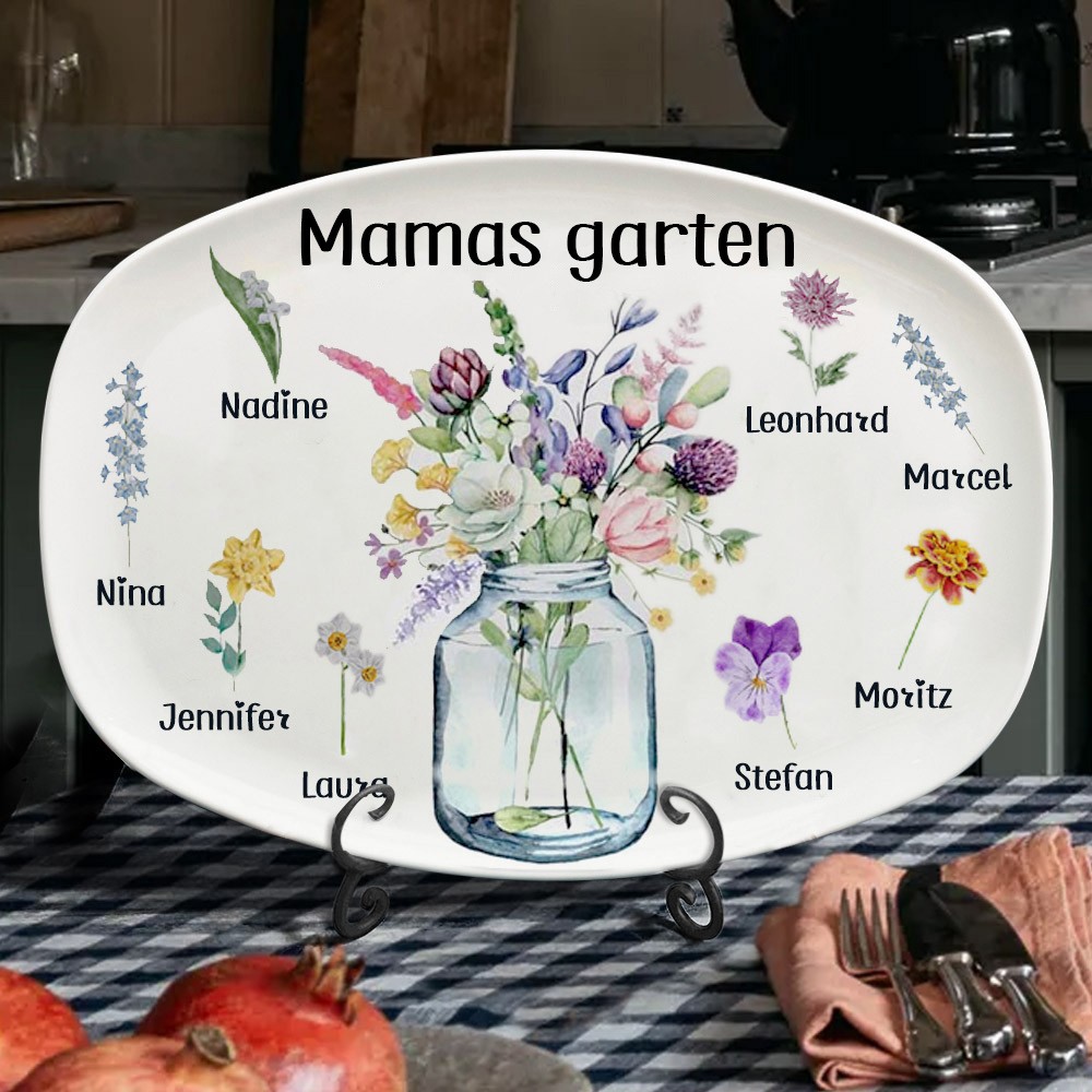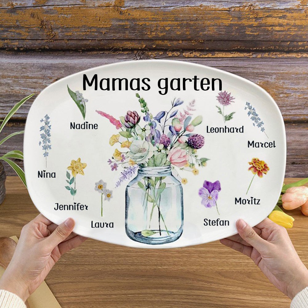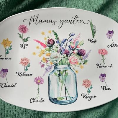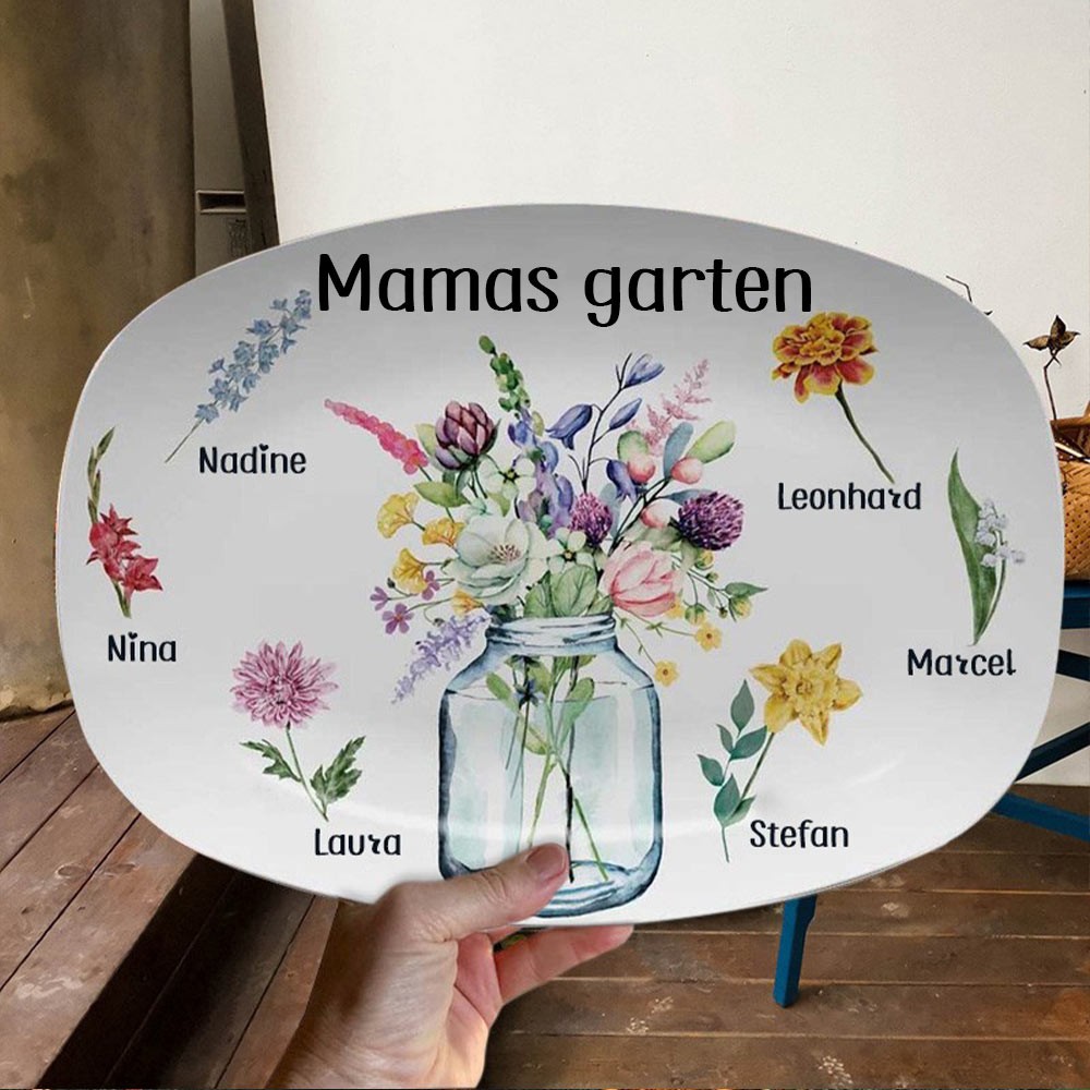 Personalisierter Muttergarten-Druckteller mit Geburtsblume und Kindernamen, einzigartiges Geburtstags-Kochgeschenk für Mama und Oma, besonderes Muttertagsgeschenk