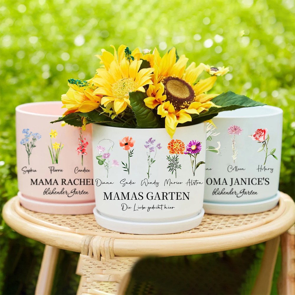 Personalisierter Kunstdruck, Omas Garten, Blumentopf zur Geburt, mit Namen der Enkelkinder, Familiengartengeschenk für Mama, Oma, einzigartiges Muttertagsgeschenk