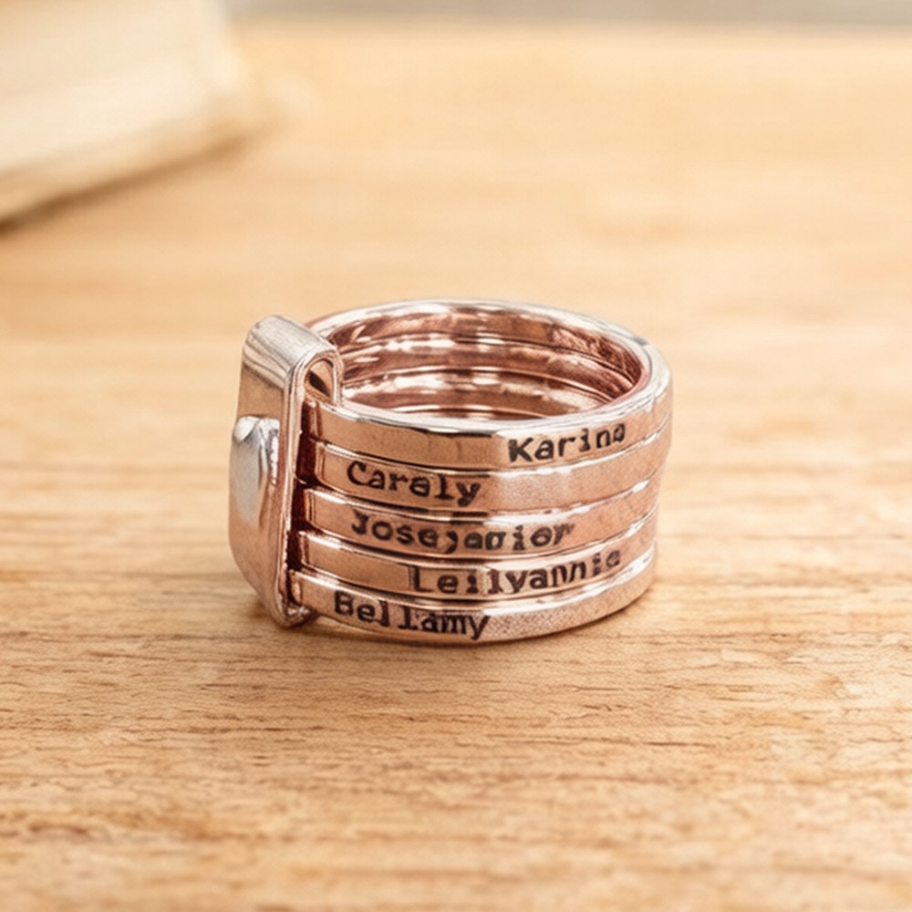 Personalisierter Familiennamensring für Sie – Herzförmiger Stapelring, Edelstahl, perfektes Geschenk für Mama oder frischgebackene Mutter