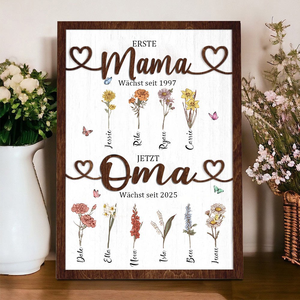 Personalisierter Holzrahmen mit dem Aufdruck „Erste Mama, jetzt Oma“ und Geburtsblumen, mit den Namen der Kinder. Ein einzigartiges Geburtstagsgeschenk für Mama oder Oma, ein Geschenk zur Babyparty und kreative Geschenkideen zum Muttertag.