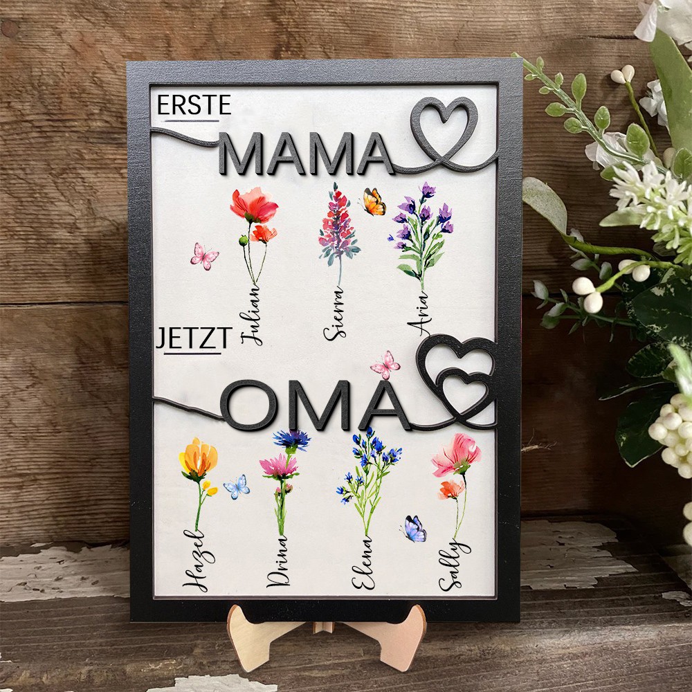 Personalisierter Holzrahmen mit dem Aufdruck „Erste Mama, jetzt Oma“ und Geburtsmonat-Blumen, mit den Namen der Kinder. Ein einzigartiges Geburtstagsgeschenk für Mama oder Oma und kreative Geschenkideen zum Muttertag.