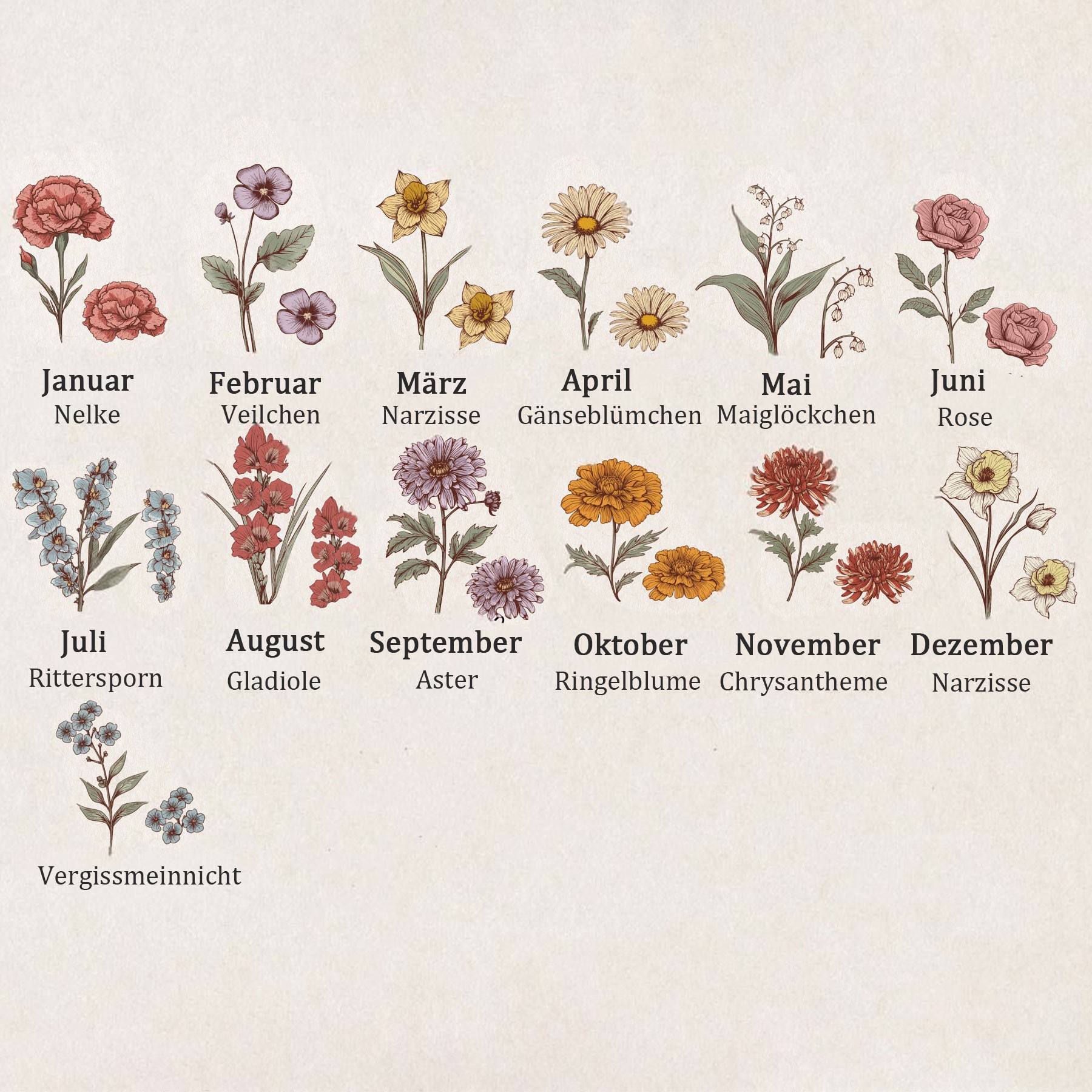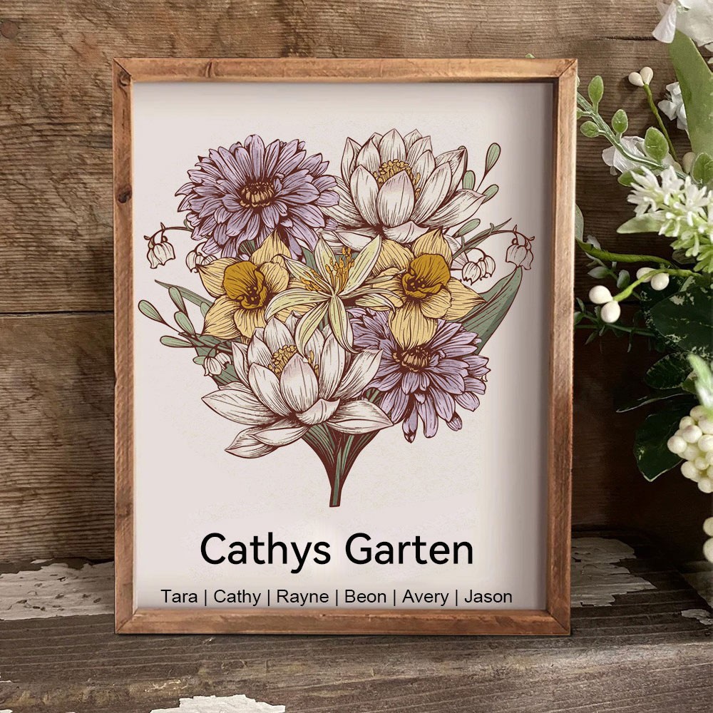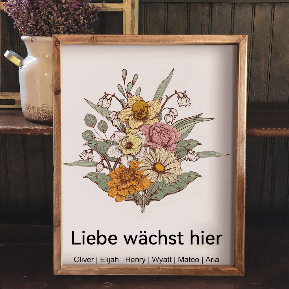 Personalisierter Kunstdruck im Holzrahmen, Familienplakette mit Geburtsblumen und Kindernamen, Geschenkidee für Mama und Oma zum Muttertag und zu Weihnachten