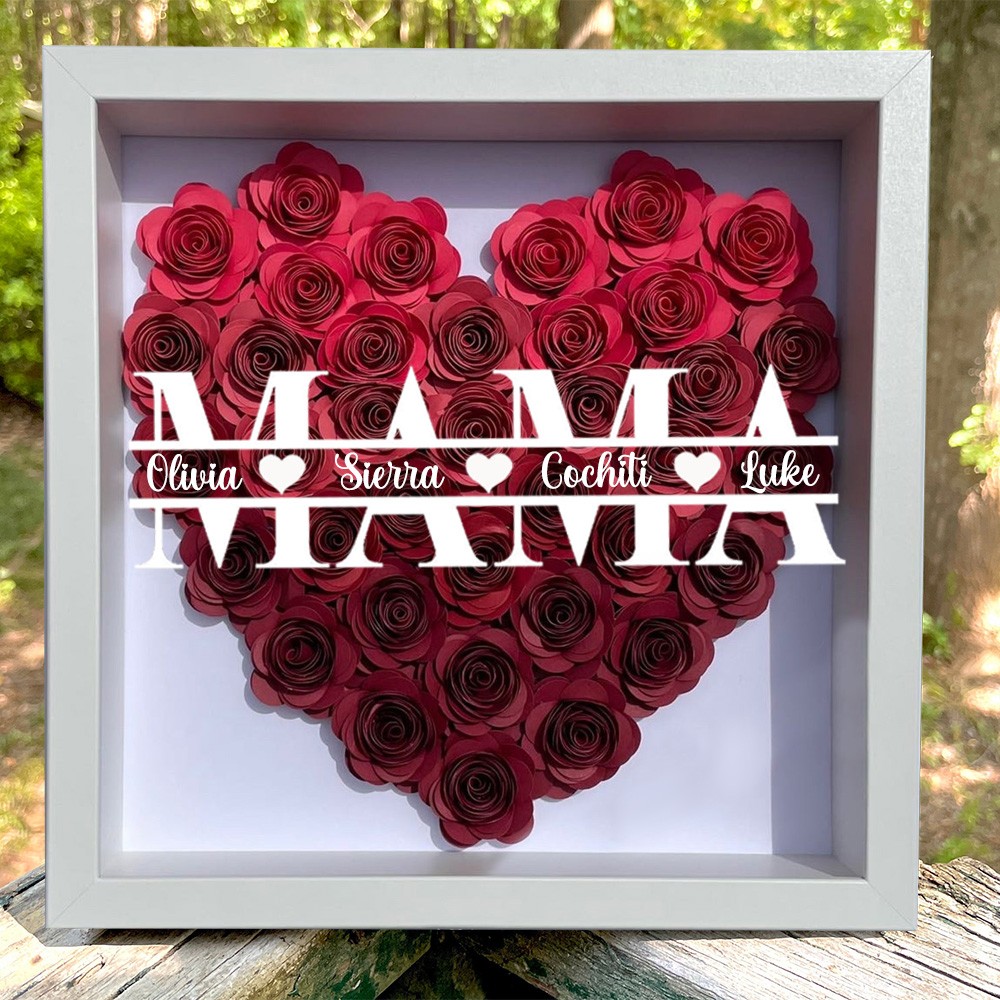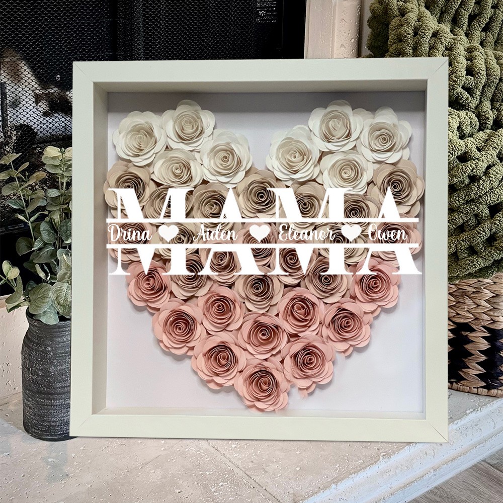 Personalisierte Papierblumen-Schatten-Holzkiste mit Kunstdruck, Mutter- und Kindernamen, einzigartiges Erinnerungsgeschenk für Mutter und Oma, einzigartige Geschenkideen zum Muttertag