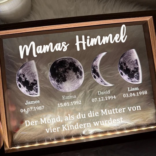Personalisierter Nachtlichtrahmen mit Mondphasen für Mamas Himmel und den Namen der Kinder. Einzigartige Geschenke für Mama. Geschenkideen zum Muttertag.
