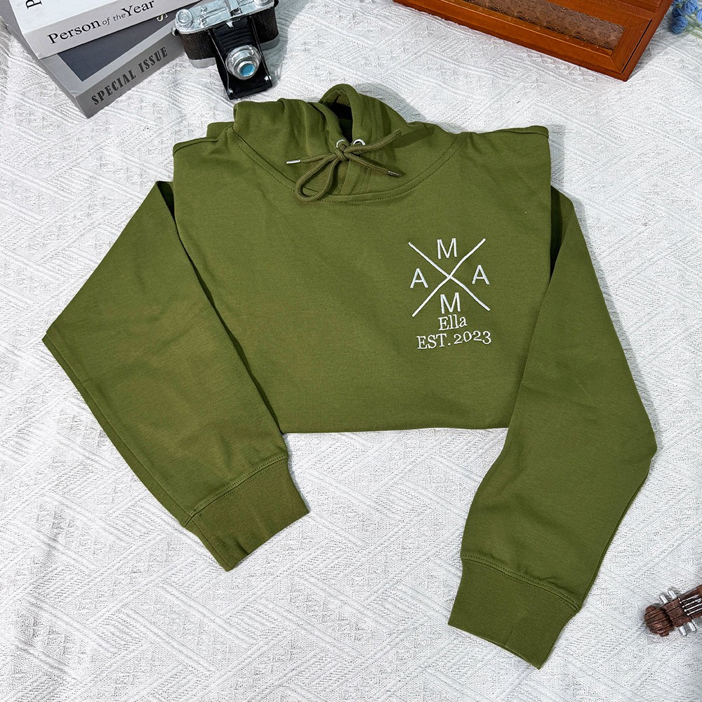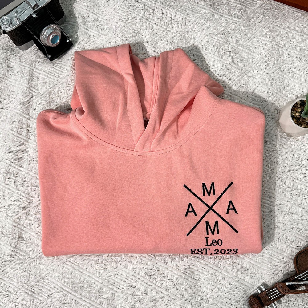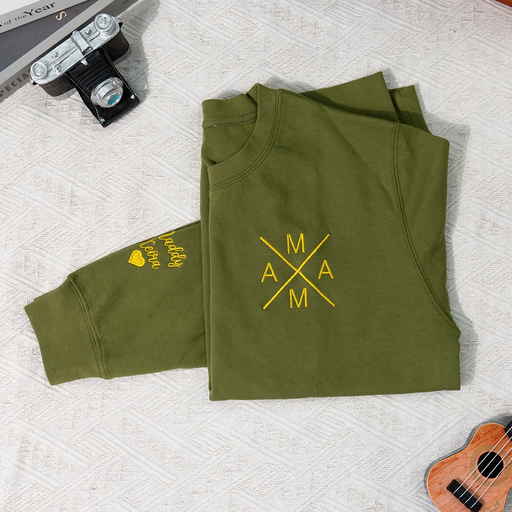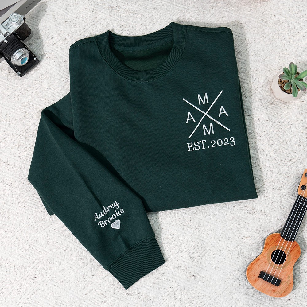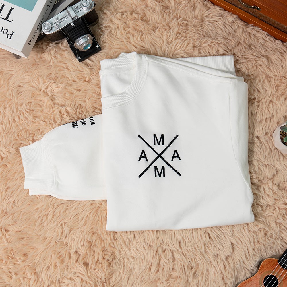 Personalisiertes besticktes Mama-Sweatshirt mit Kindernamen auf dem Ärmel. Muttertagsgeschenk für Mama und Oma