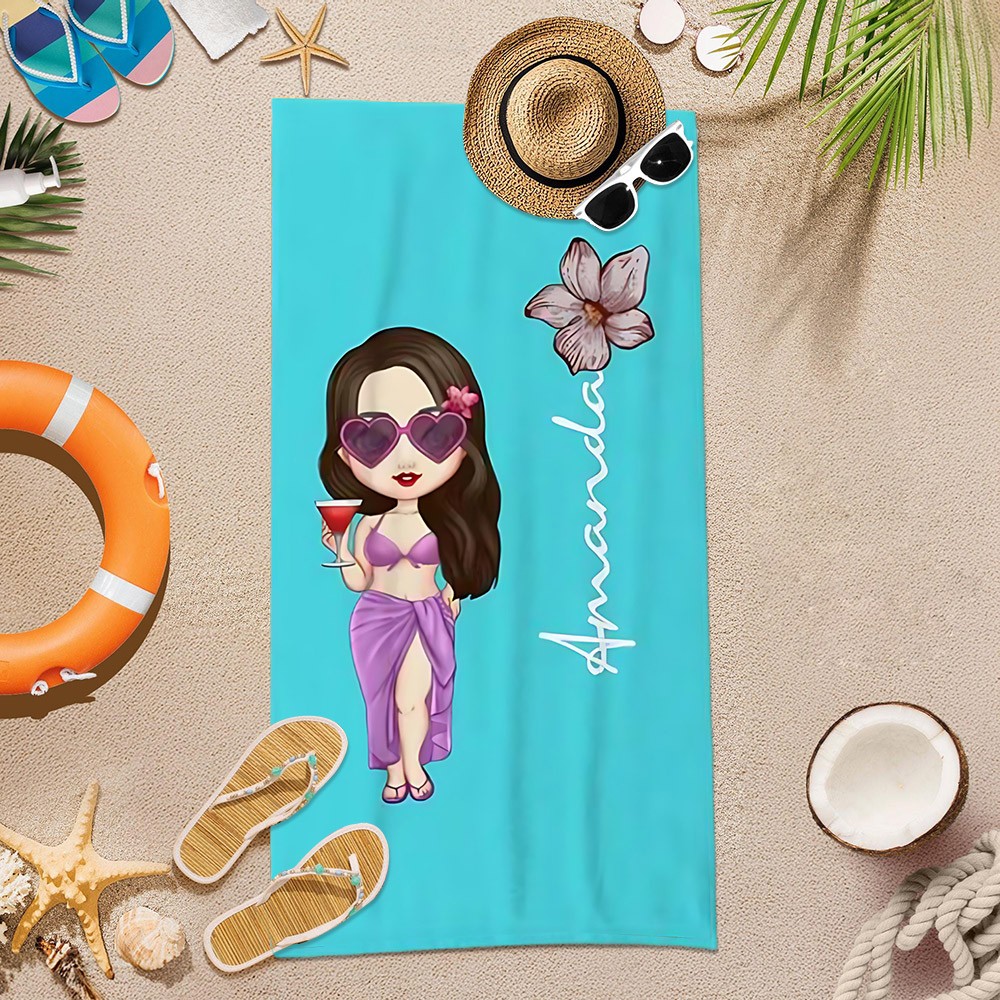 Personalisiertes Cartoon-Frauen-Strandtuch mit Namen und Geburtsblume, individuelles Urlaubs-Pooltuch, Cartoon-Mädchen-Geschenk für die beste Freundin und Teenager