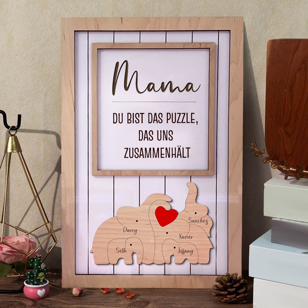 Personalisiertes Holzschild mit Elefanten-Familien-Puzzleteilen und Kindernamen, einzigartiges Geburtstagsgeschenk für Mama und Oma, besondere Geschenkideen zum Muttertag, Schwangerschaftsgeschenkideen