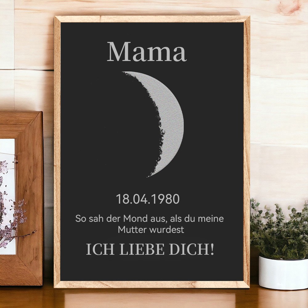 Personalisiertes Kunstdruck-Mutterschild aus Holz mit Mondphasen und Datum, einzigartiges Geschenk für frischgebackene Mutter, Muttertagsgeschenk