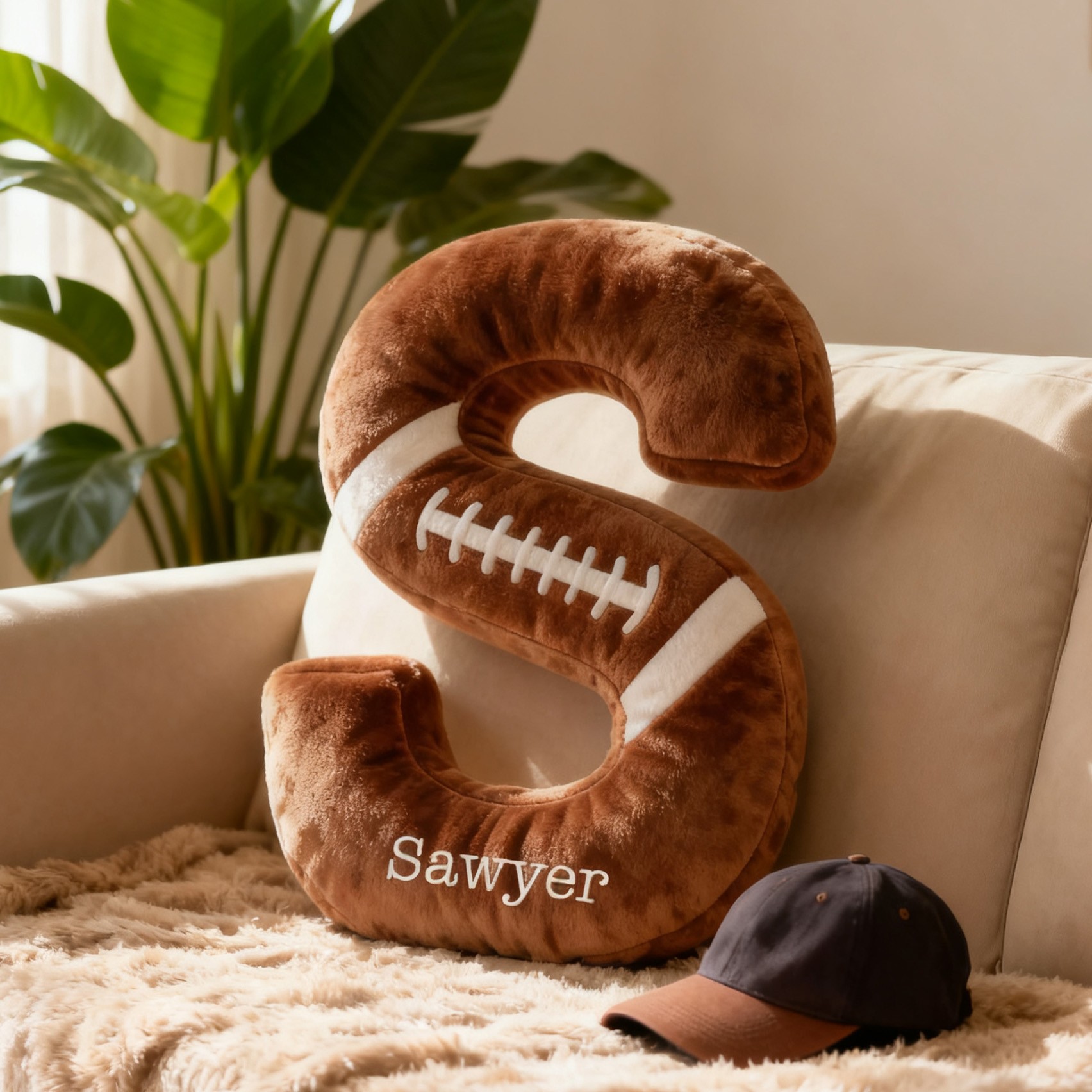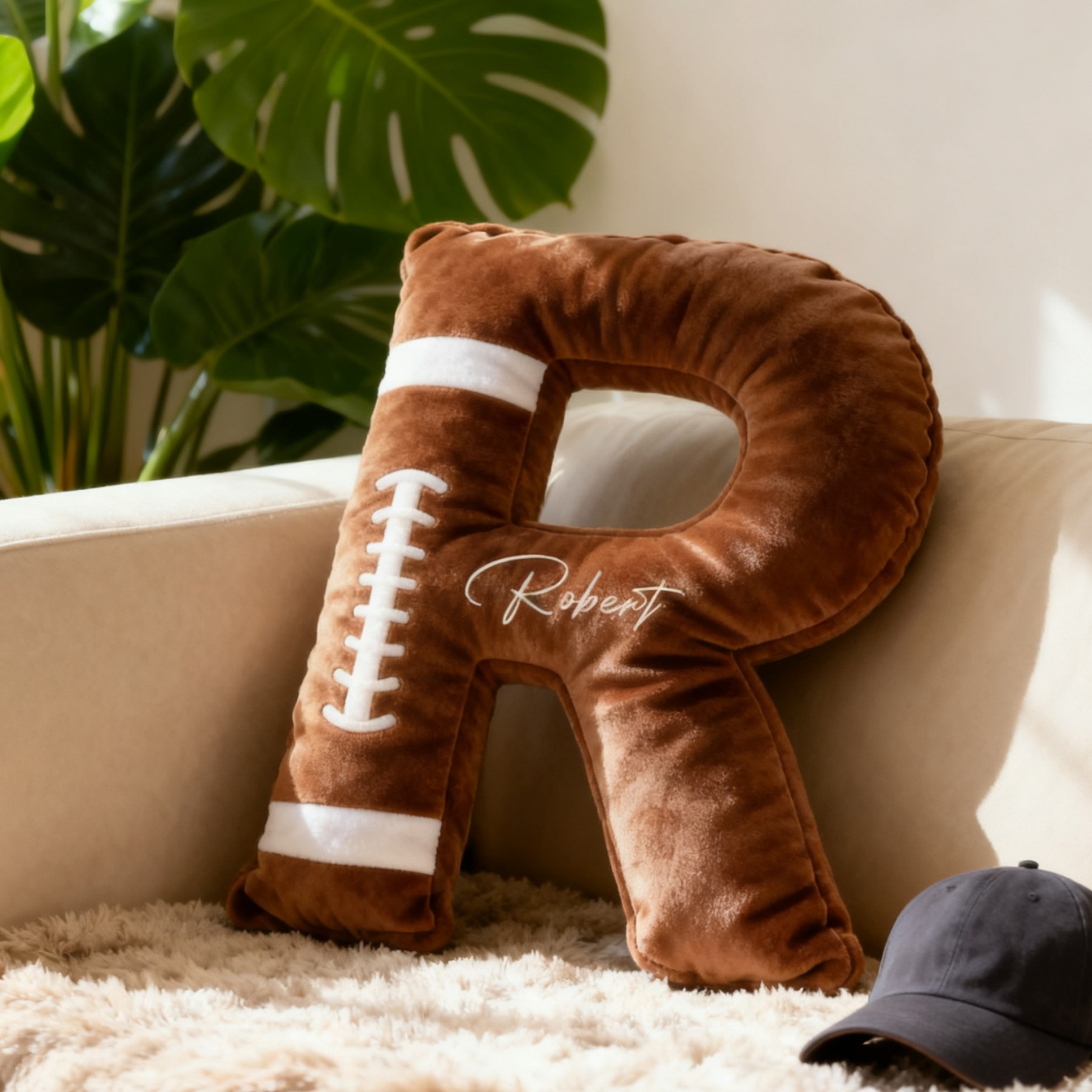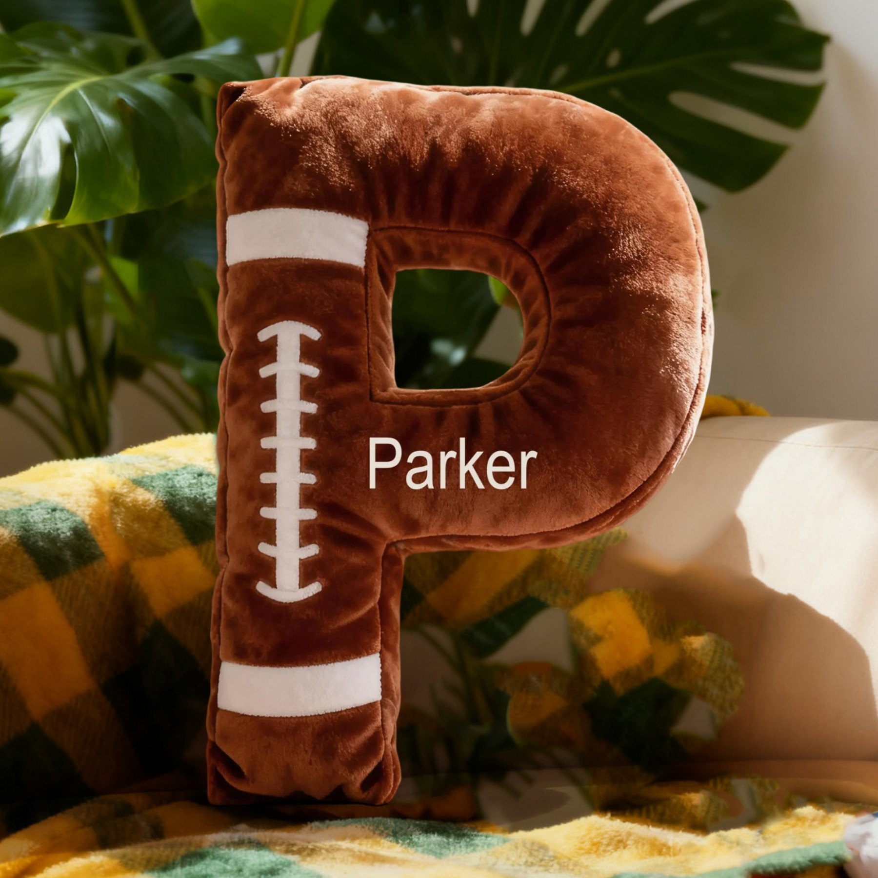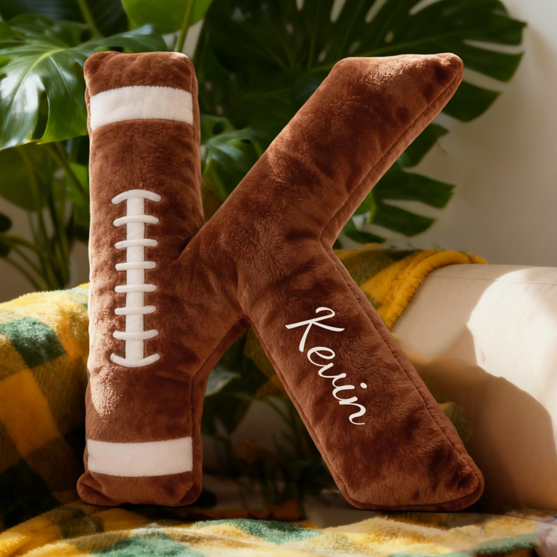 Personalisiertes Kissen in Buchstabenform mit Fußballmotiv und individuellem Namen – das perfekte Weihnachtsgeschenk für Fußballfans