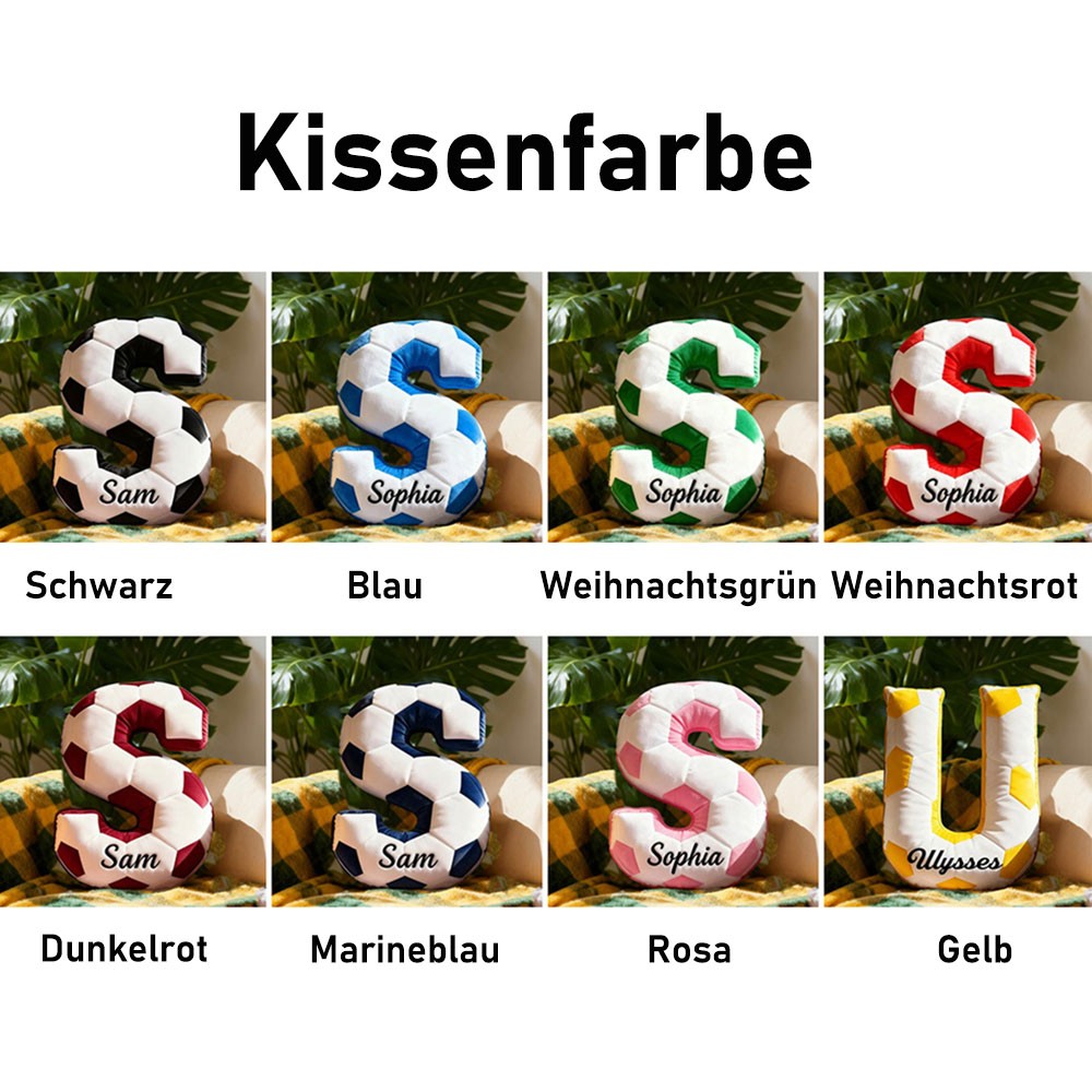 Personalisiertes Kissen in Buchstabenform mit Fußballmotiv und individuellem Namen – das perfekte Weihnachtsgeschenk für Fußballfans