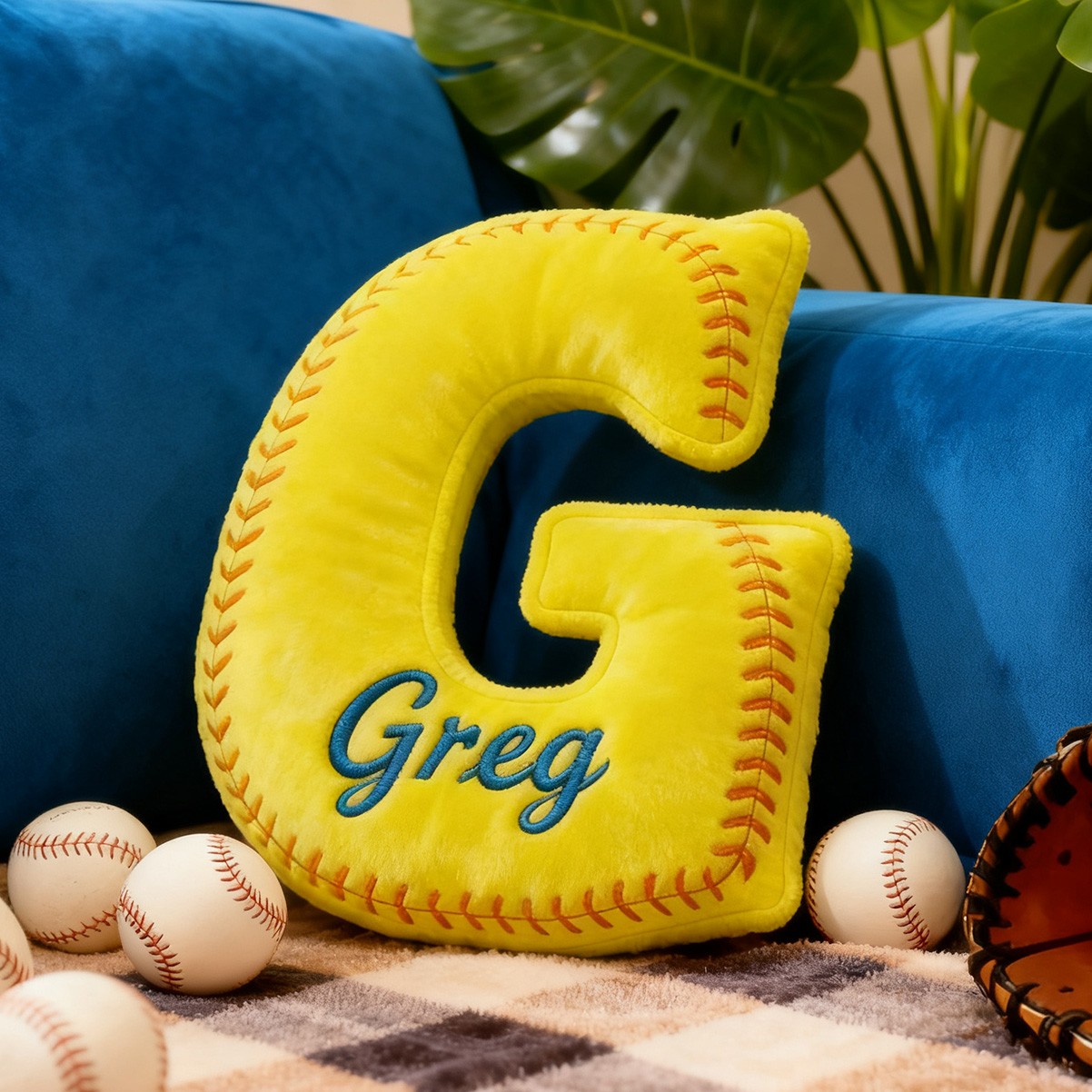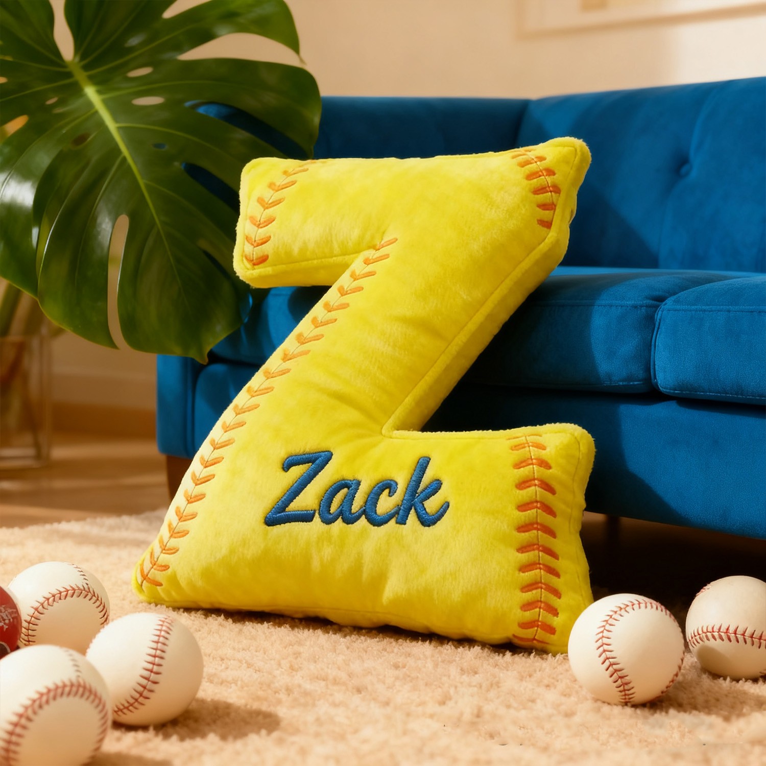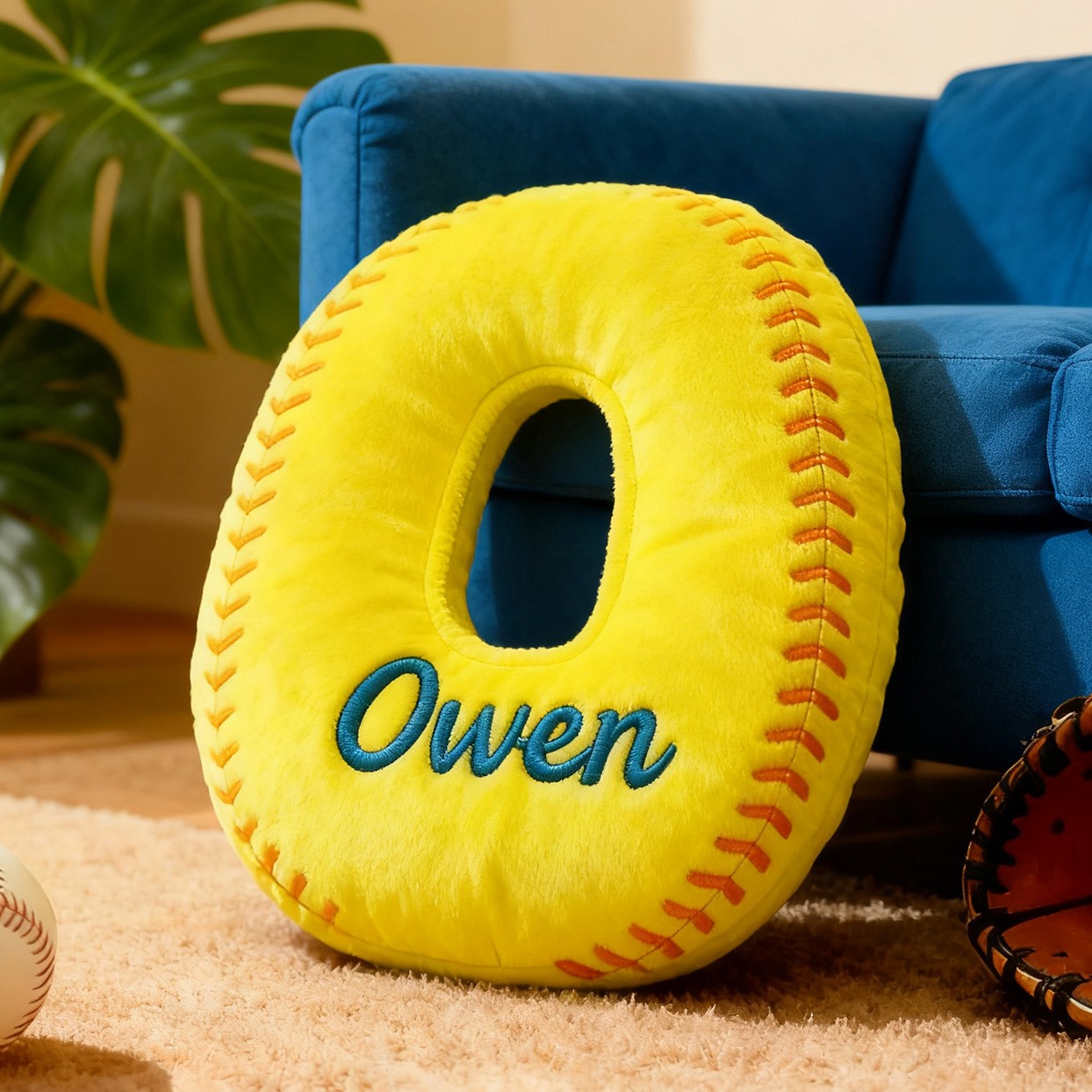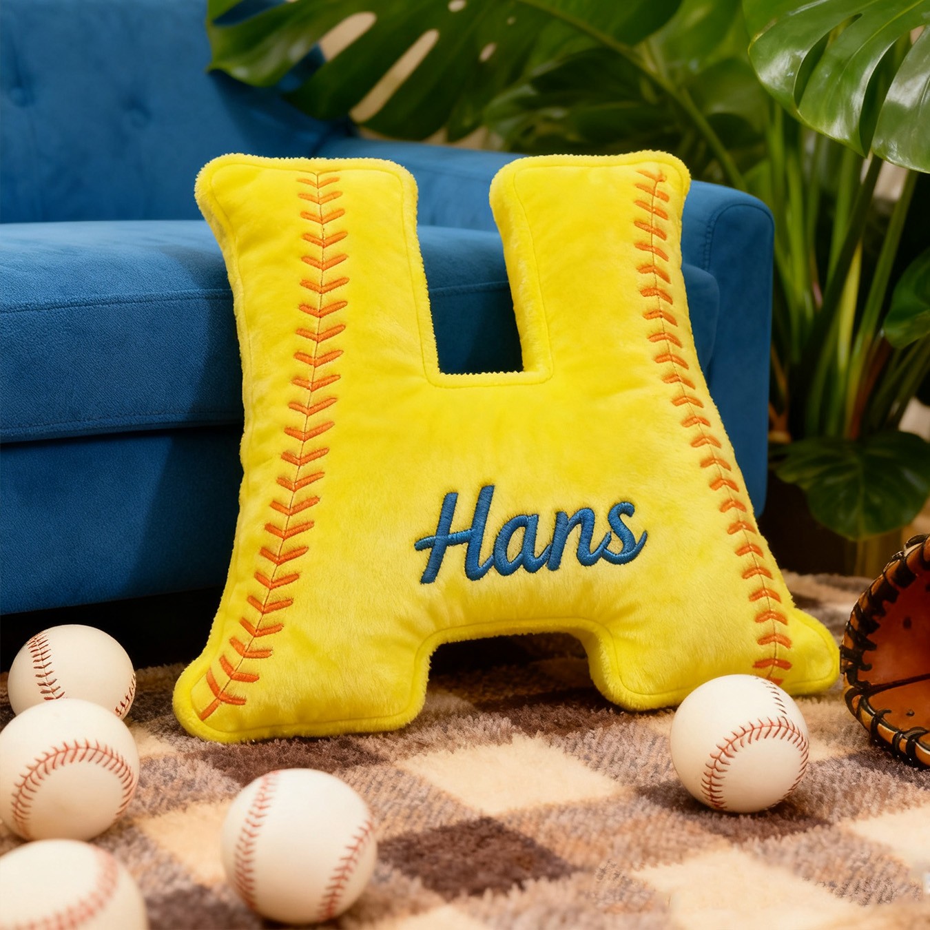 Personalisiertes Kissen in Buchstabenform mit Softball-Motiv und individuellem Namen – das perfekte Weihnachtsgeschenk für Softball-Fans!