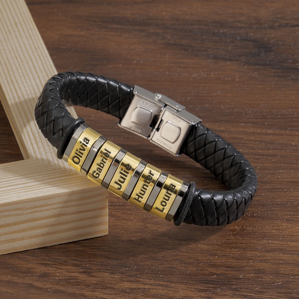 Personalisiertes Lederarmband mit Perlen für Männer mit den Namen Ihrer Kinder. Einzigartige Geschenkideen zum Vatertag.