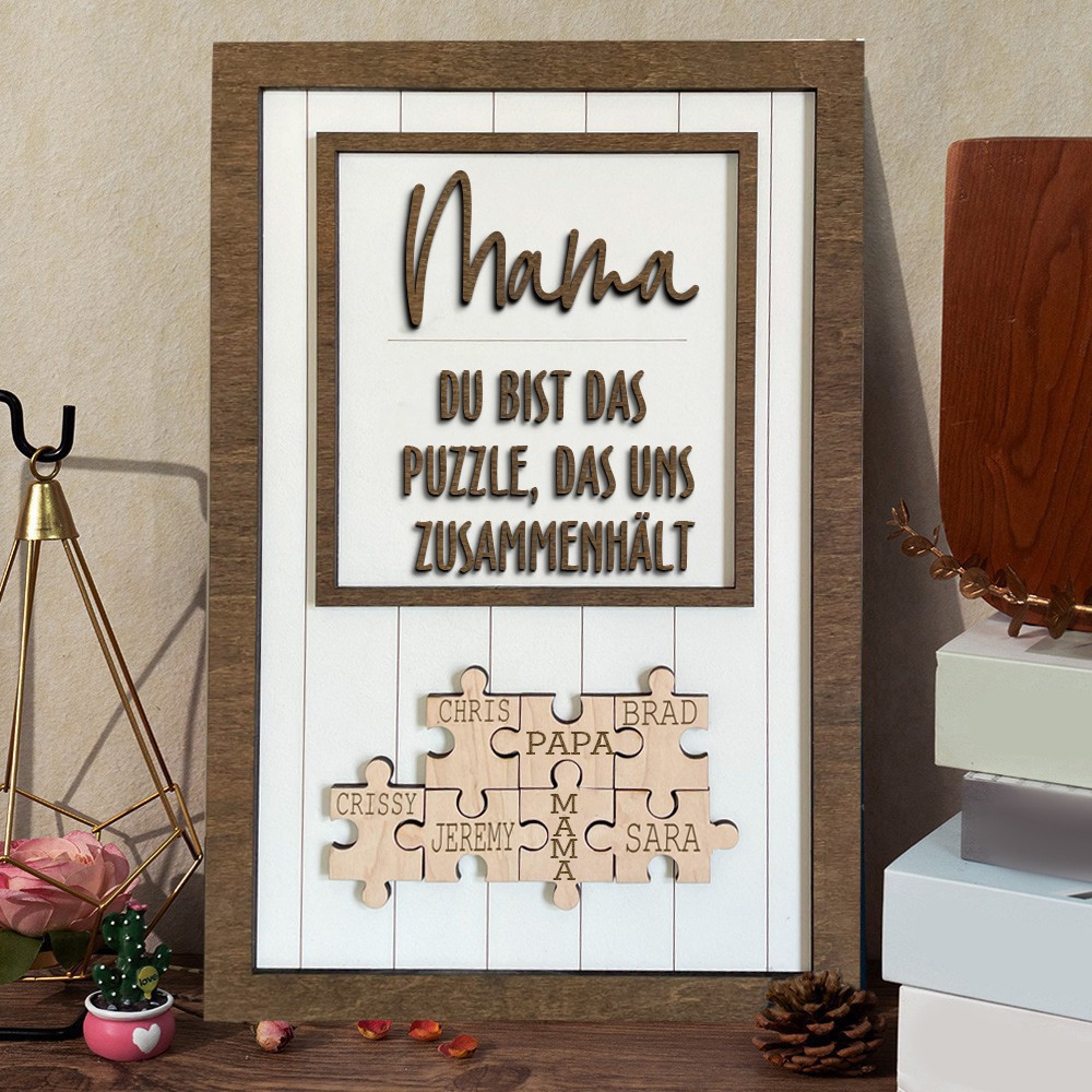 Personalisiertes Namensschild aus Holz mit Puzzleteilen für Mütter: Du bist das Teil, das uns zusammenhält. Einzigartige Geschenkideen zum Muttertag, Familienandenken, Geschenk für Mama und Oma