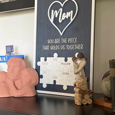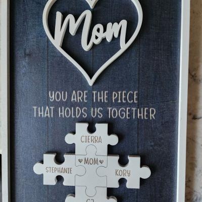 Personalisiertes Mama-Puzzle-Schild mit Namen, das uns zusammenhält. Geschenkideen zum Muttertag, einzigartiges Familienandenken für Mama und Oma