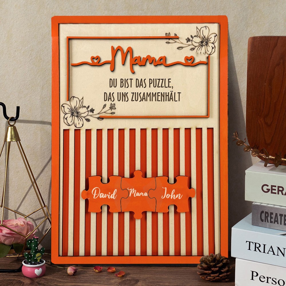 Personalisiertes Puzzleteilschild aus Holz „Mama, du bist diejenige, die uns verbindet“, individuelles Geschenk für Mama mit Ständer, einzigartige Geschenkidee zum Muttertag