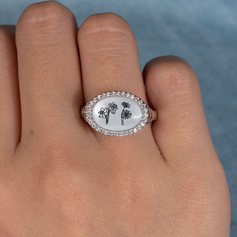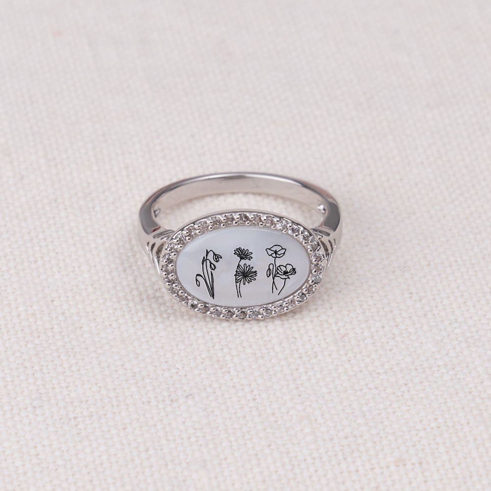 Anillo de flor de nacimiento de concha ovalada personalizado, regalo familiar único para mamá, abuela, ideas de regalos para el día de la madre