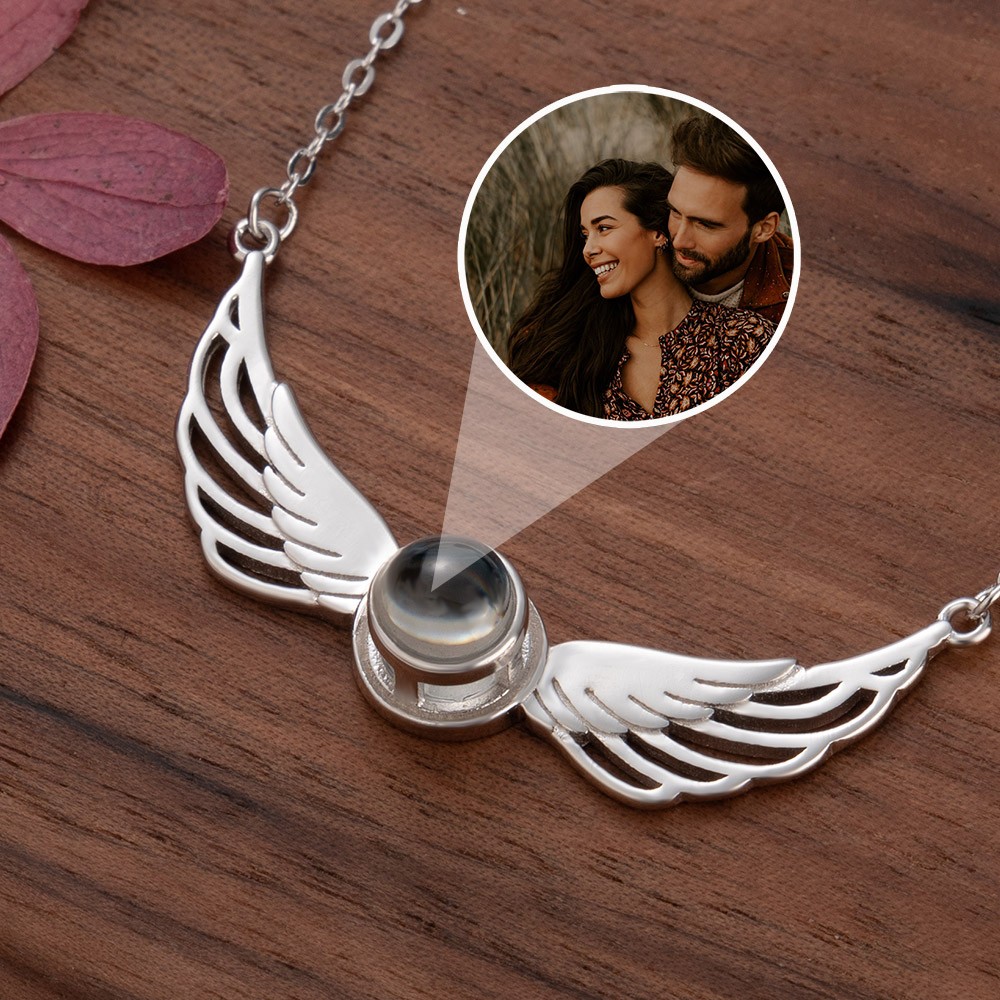 Collar personalizado con proyección de alas de ángel con imagen en su interior. Regalos de cumpleaños para pareja. Regalo de amor para ella.