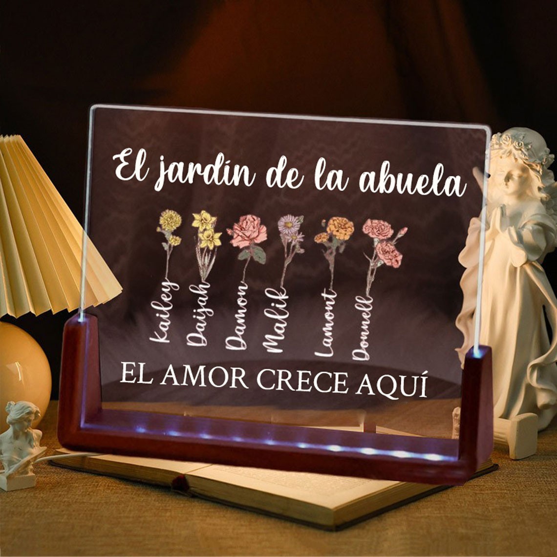 El amor crece aquí en el jardín de mamá. Mes de nacimiento. Luz de noche de madera con flores. Ideas de regalos personalizados para mamá, abuela y el Día de la Madre.