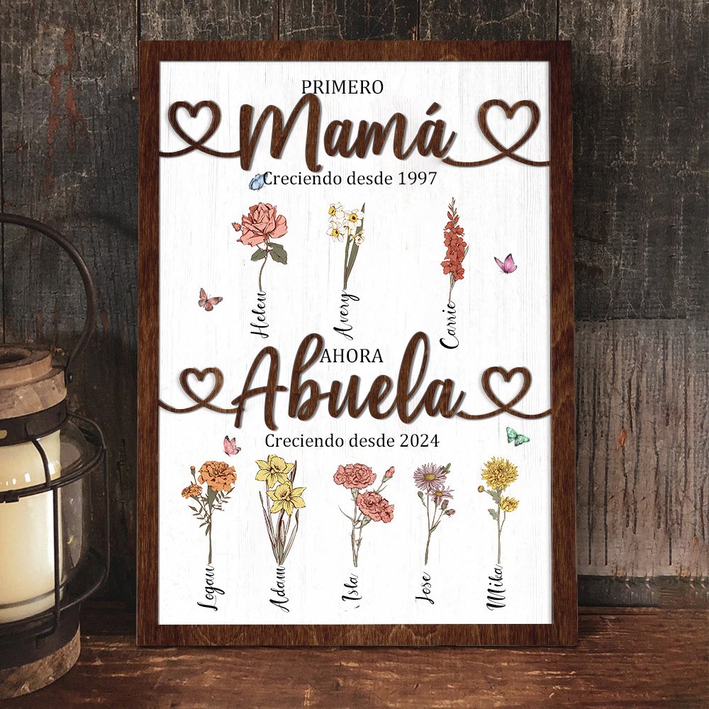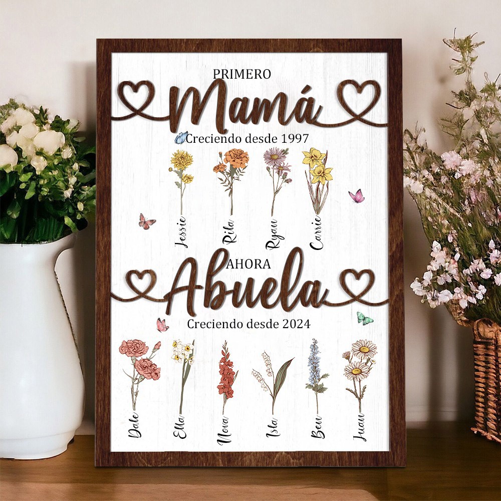 Impresión personalizada 'Primera mamá, ahora abuela' con flores de nacimiento, cartel en marco de madera con los nombres de los niños. Arte familiar único, regalo de cumpleaños para mamá/abuela, ideas de regalos para el Día de la Madre.