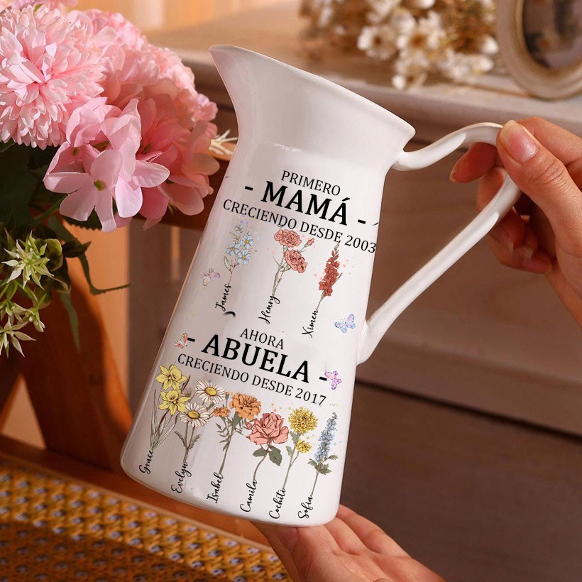 Jarrón de flores personalizado para el primer mes de nacimiento de mamá y ahora abuela con nombres de niños, regalo de cumpleaños único, regalo familiar para mamá y abuela, ideas de regalo para el Día de la Madre