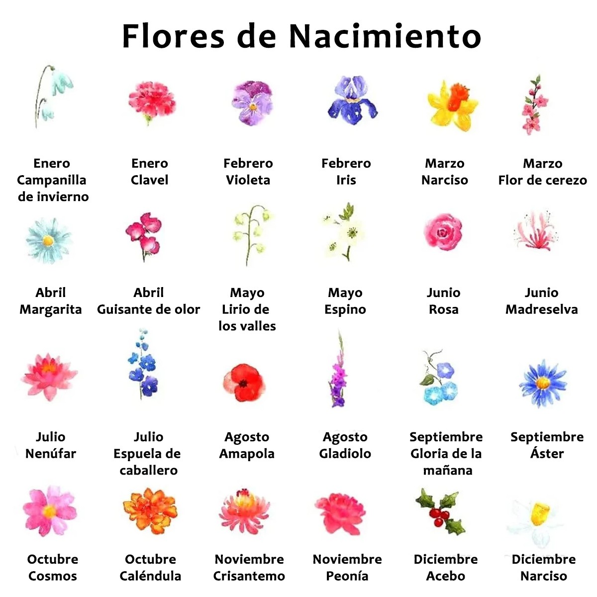 -- Seleccionar 12º Tipo de Flor -- Enero-Clavel Enero-Campanilla de invierno Febrero-Iris Febrero-Violeta Marzo-Flor de cerezo Marzo-Narciso Abril-Guisante de olor Abril-Margarita Mayo-Lirio de los valles Mayo-Espino Junio-Madreselva Junio-Rosa Julio-Espuela de caballero Julio-Nenúfar Agosto-Amapola Agosto-Gladiolo Septiembre-Áster Septiembre-Gloria de la mañana Octubre-Caléndula Octubre-Cosmos Noviembre-Crisantemo Noviembre-Peonía Diciembre-Acebo Diciembre-Narciso