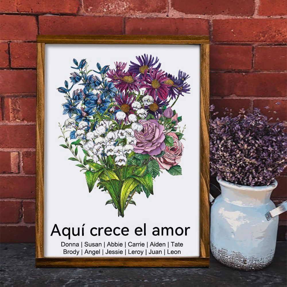 Lámina de Arte Familiar Personalizada: Ramo de Flores de Nacimiento Enmarcado con Nombres de Niños. Regalo de Cumpleaños Único para Mamá o Abuela. Ideas de Regalos para el Día de la Madre.