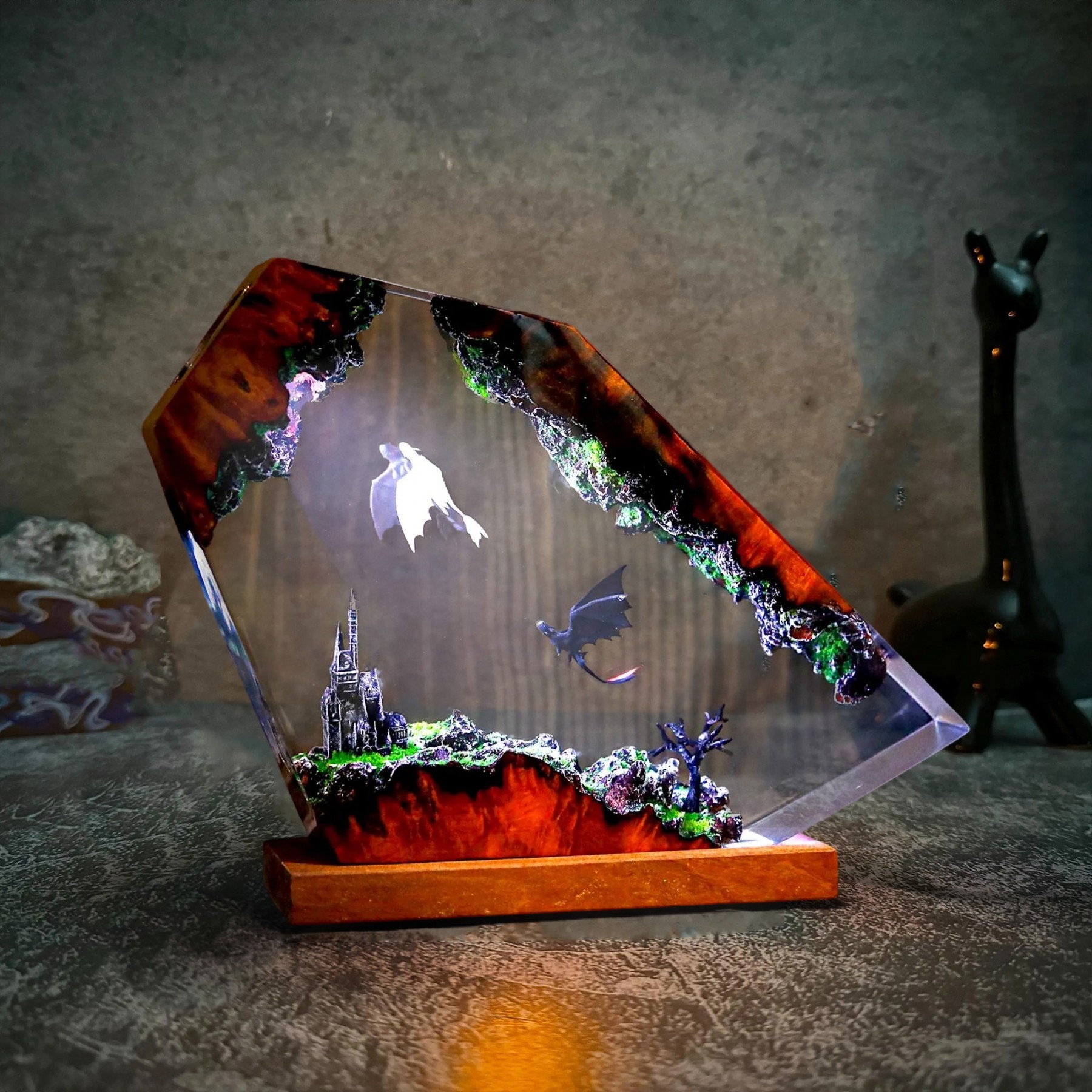 Lámpara Artesanal de Madera y Resina Epoxi con Dragón de Hielo. Regalo de Navidad y Cumpleaños para Parejas o para Él.
