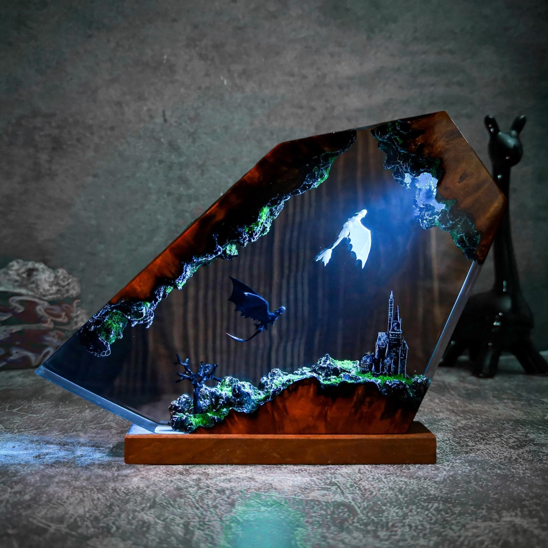 Lámpara de Madera y Arte en Resina Dragón Volador, Regalo para Pareja, Regalo de Cumpleaños para Él, Regalos de Navidad