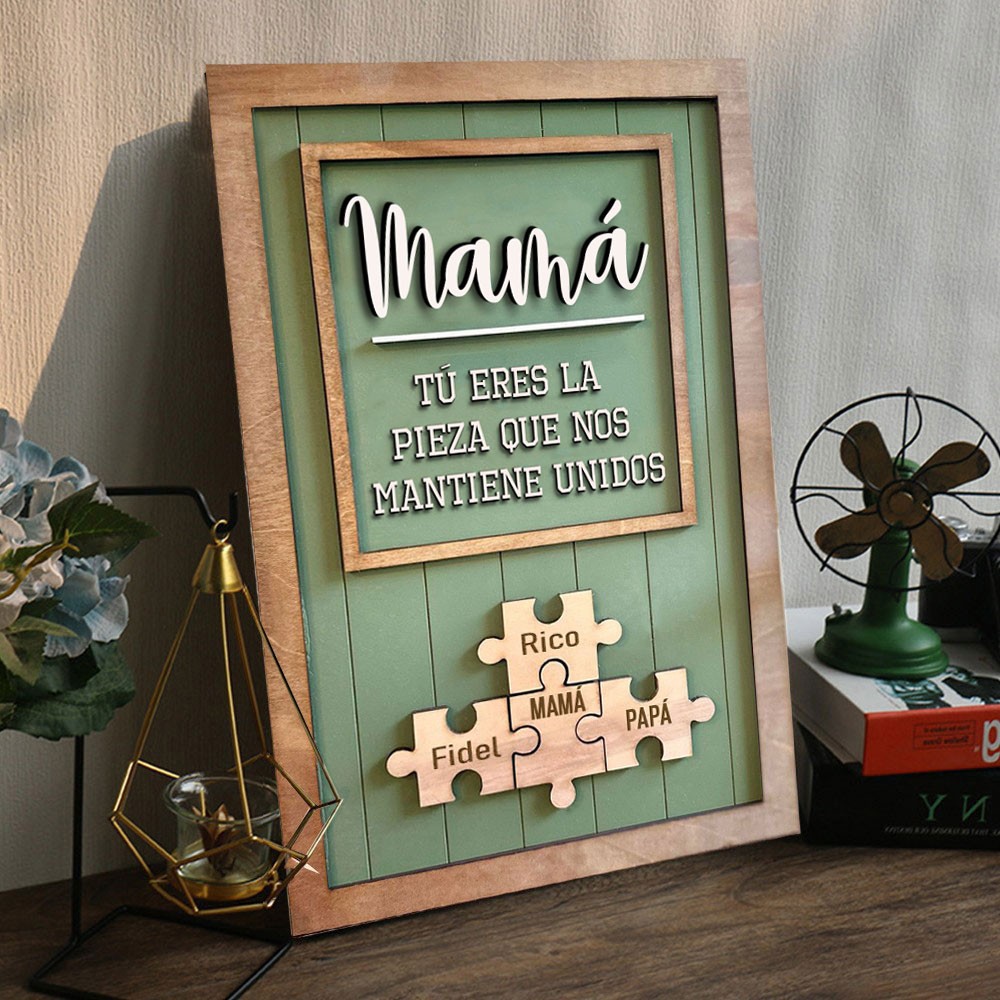 Letrero de madera personalizado "Eres la pieza que nos mantiene unidos" con los nombres de los niños, regalo para el Día de la Madre.