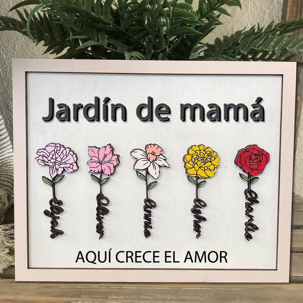 Letrero de marco de madera personalizado 'El amor crece aquí' para el jardín de la abuela, con acuarela personalizada y flores de nacimiento. Regalo único con nombres para mamá, abuela, o ideal para el Día de la Madre.