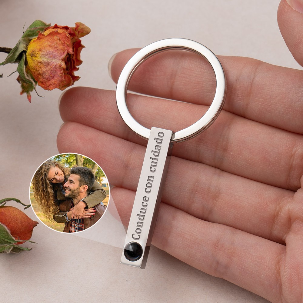 Llavero personalizado con barra de proyección fotográfica grabada con imagen en su interior. Regalos únicos para él. Ideas de regalos de San Valentín para novio