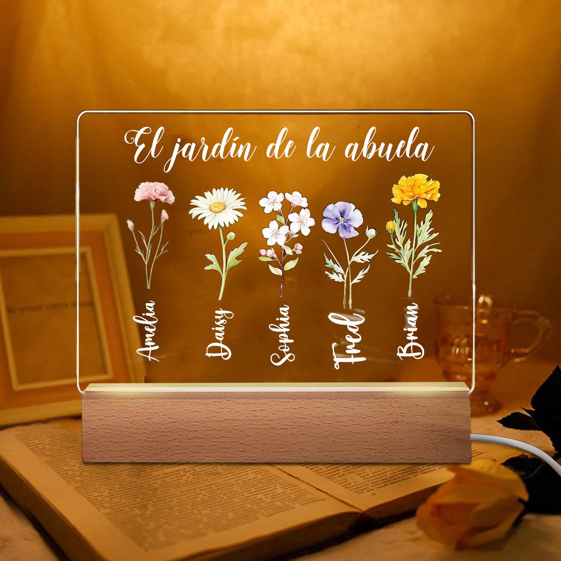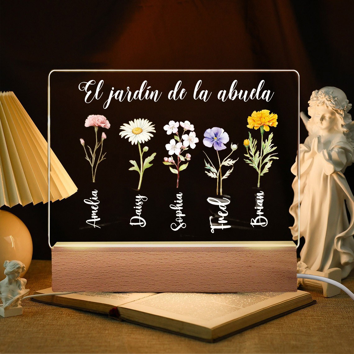 Luz de noche con flores personalizada para el mes de nacimiento de la abuela con nombres de niños. Regalo de cumpleaños único para la abuela. Ideas de regalo para el Día de la Madre.