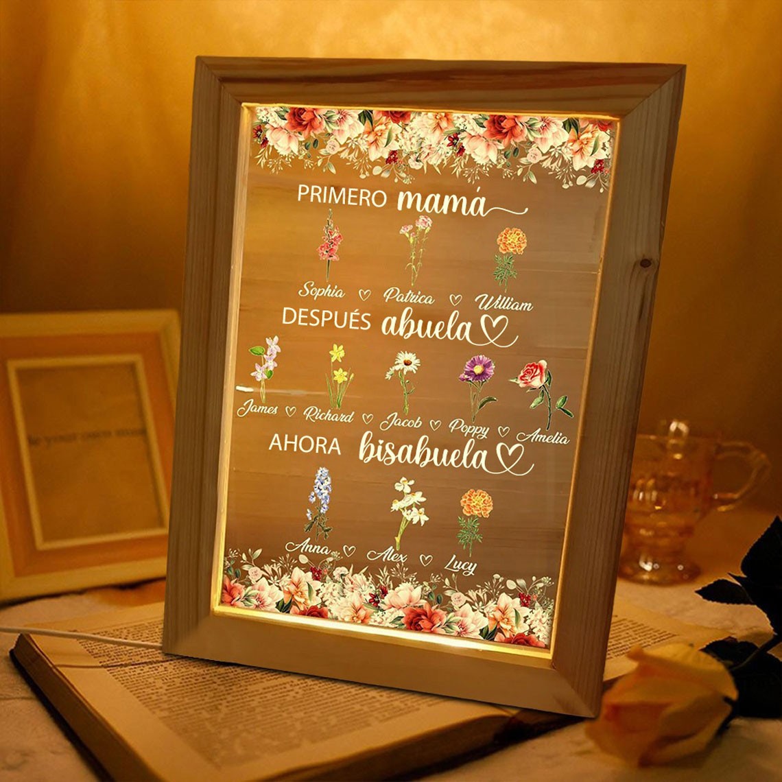 Luz de noche con marco de flores personalizado, primera mamá, luego abuela, ahora bisabuela, mes de nacimiento para mamá, abuela, regalo del Día de la Madre