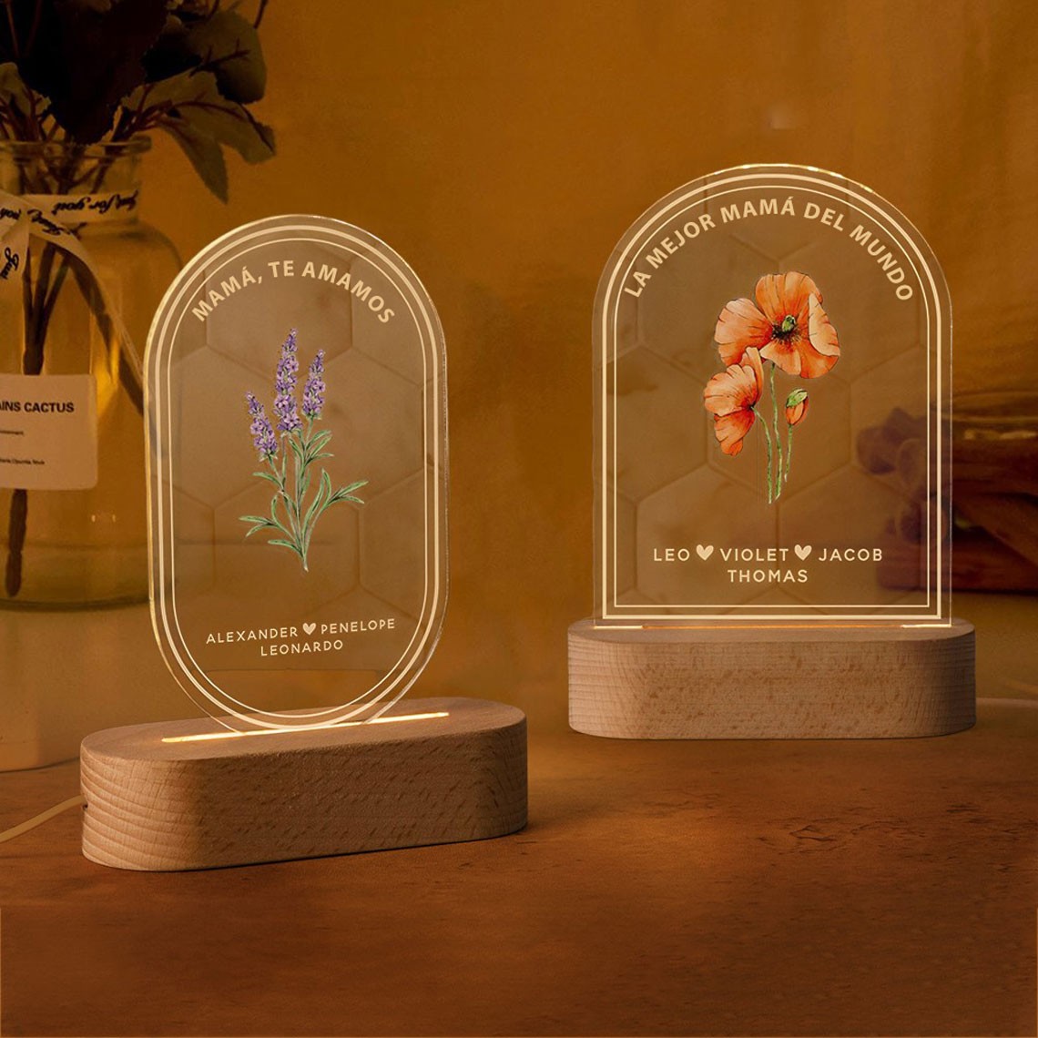 Luz de noche de flores personalizada con el mes de nacimiento y los nombres de los niños. Ideas de regalo para mamá, abuela, regalo para nueva mamá, regalos para el Día de la Madre.