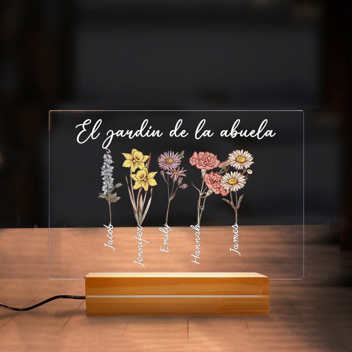 Luz de noche personalizada con diseño de flores de nacimiento para el jardín de la abuela con nombres de niños, regalos de Navidad para mamá y abuela.