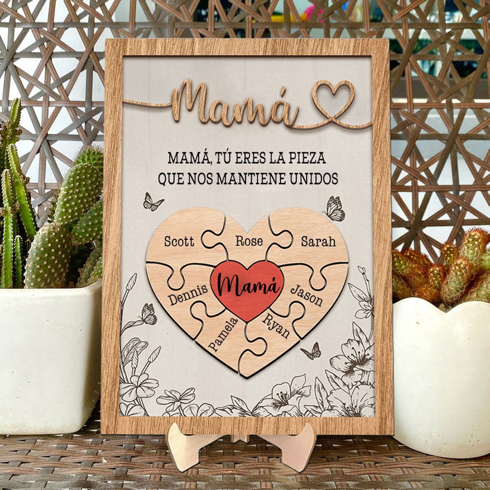 Mamá, eres la pieza que nos mantiene unidos. Letrero de madera personalizado con nombres de niños para mamá, abuela, regalo del Día de la Madre.