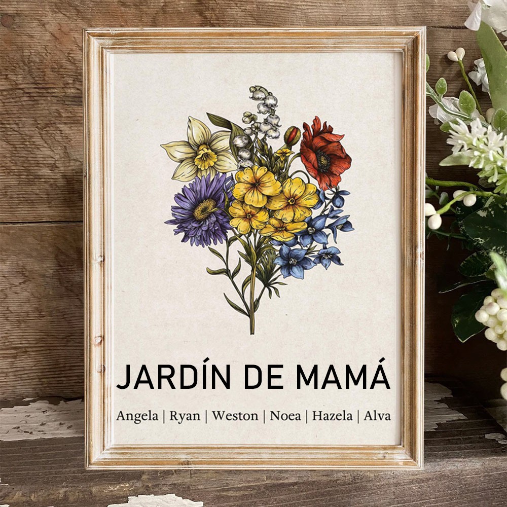 Marco de Flores de Ramo de Mes de Nacimiento con Nombres de Niños, Regalo Personalizado 'El Jardín de Mamá' de Nuestra Familia, Regalos Únicos para Mamá y Abuela, Ideas de Regalos Significativos para Navidad.