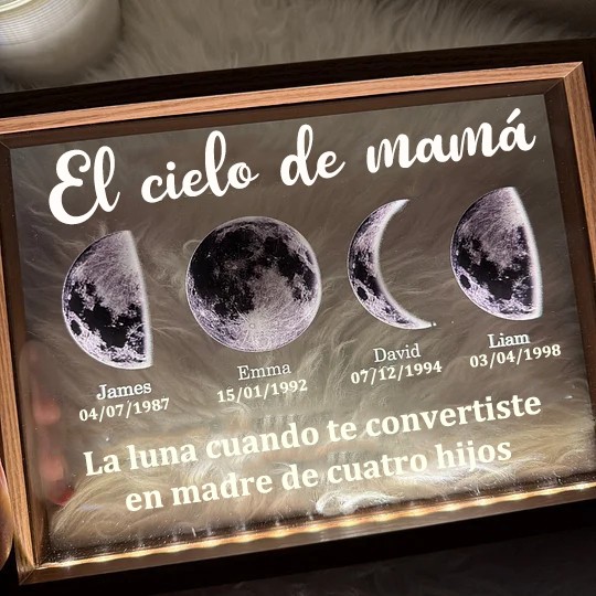 Marco de luz nocturna personalizado con fases lunares y nombres de niños. Regalos únicos para mamá. Ideas de regalo para el Día de la Madre.